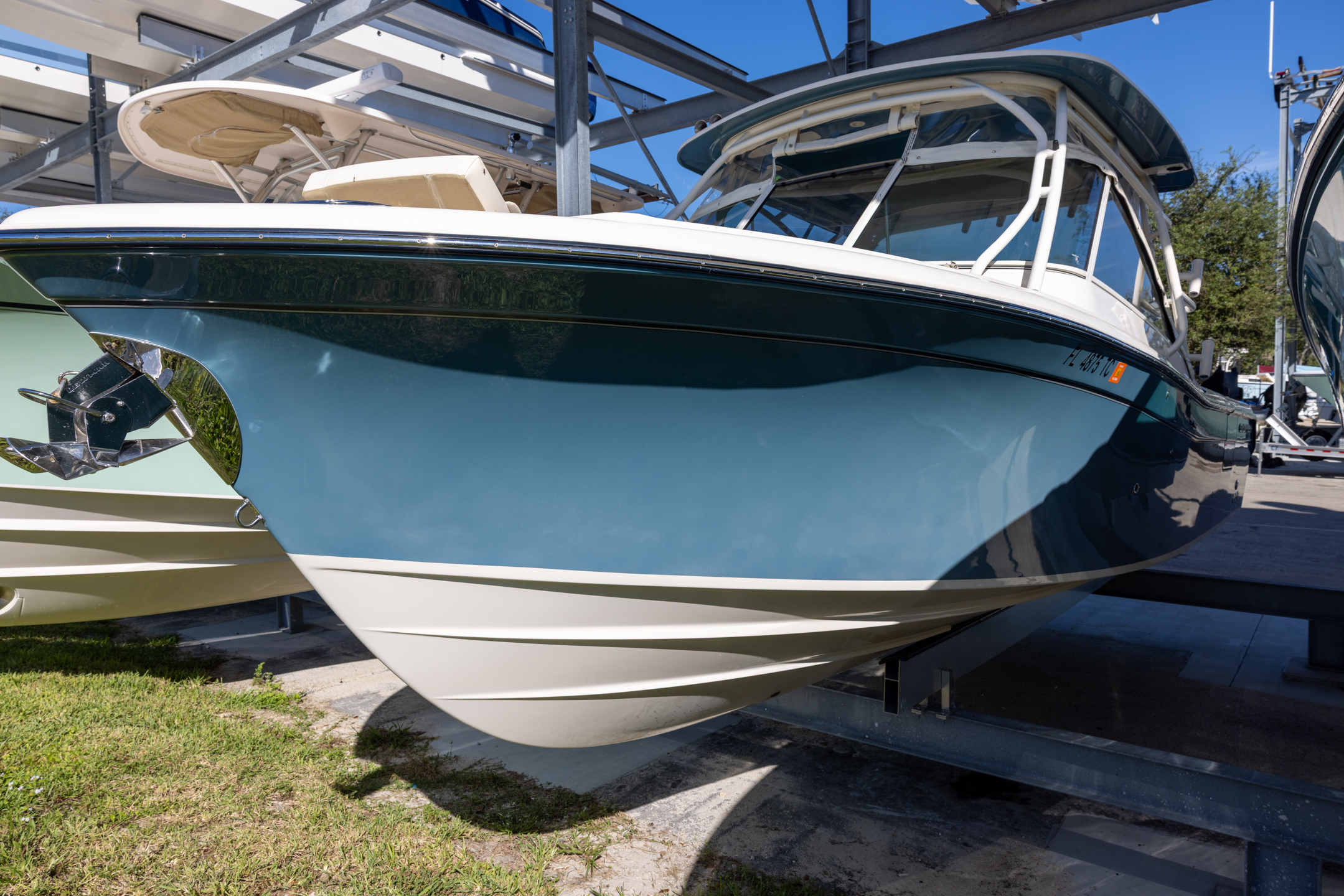 - Hardtop w/painted aluminum frame, storage net, LED spreader lights, tri-colored (red, blue, white) LED recessed lights (4), side mounted rod holders (4), outrigger plates, tow eye hardware & front & side curtains