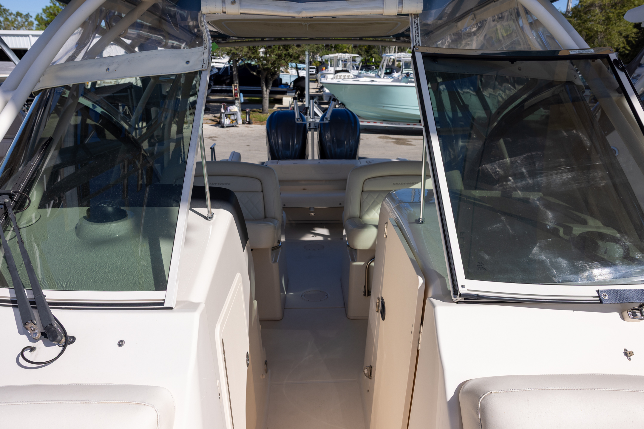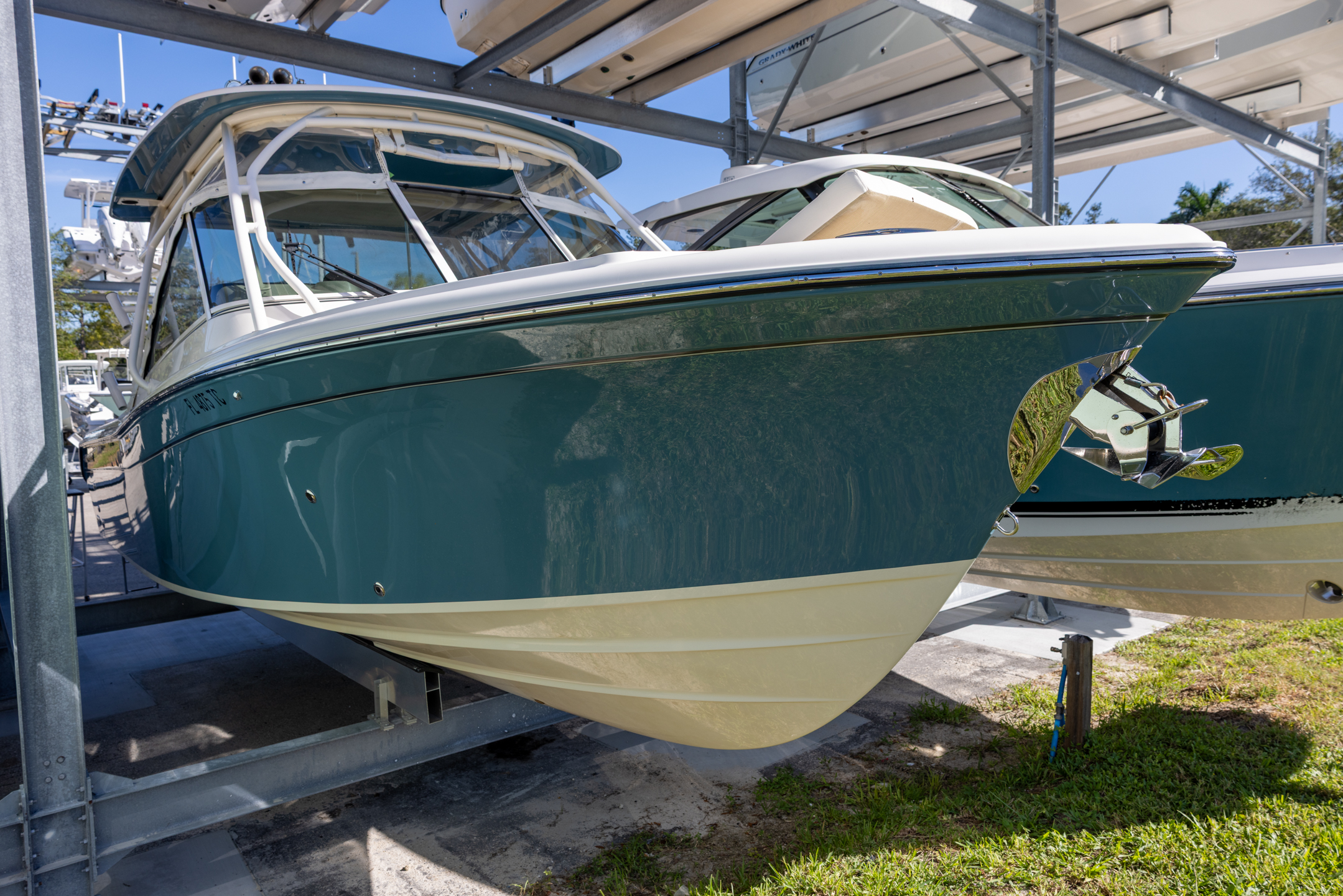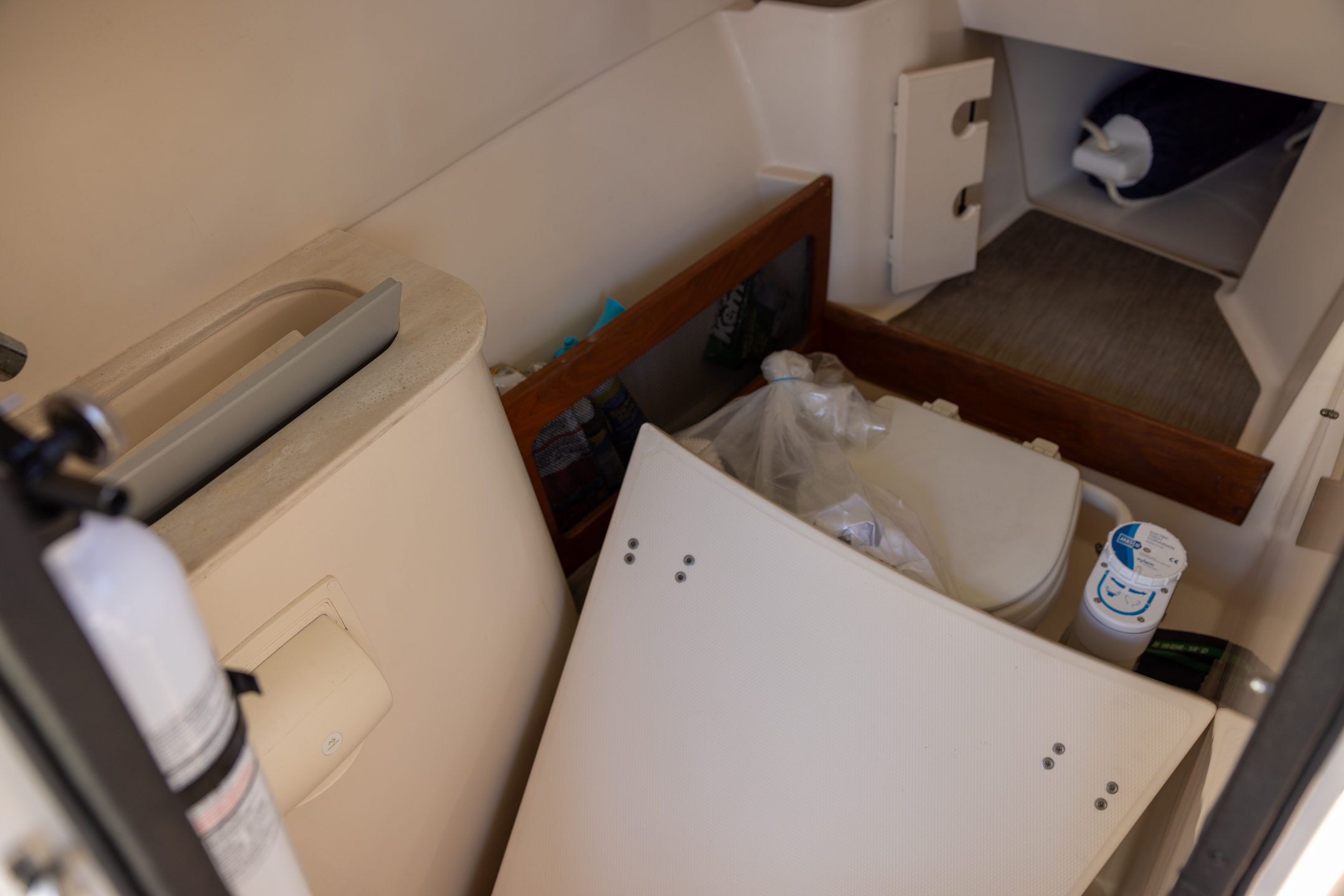 - Lockable port head console w/dome light, bulk storage, mirror w/shelf, composite cherry & holly sole, sink & marine head w/electric flush, 7.5-gallon holding tank w/macerator, overboard discharge & deck pump out