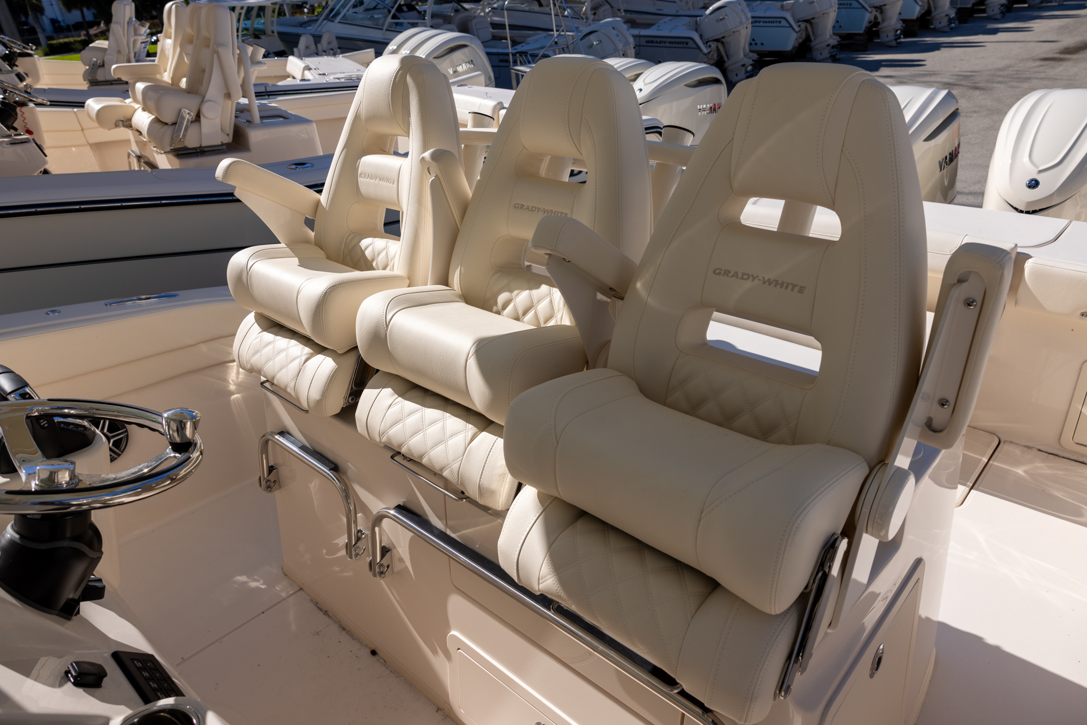 - Deluxe lean bar mounted Command Elite helm chairs (3) horizontally adjustable w/deluxe cushioning & flip-up bolsters