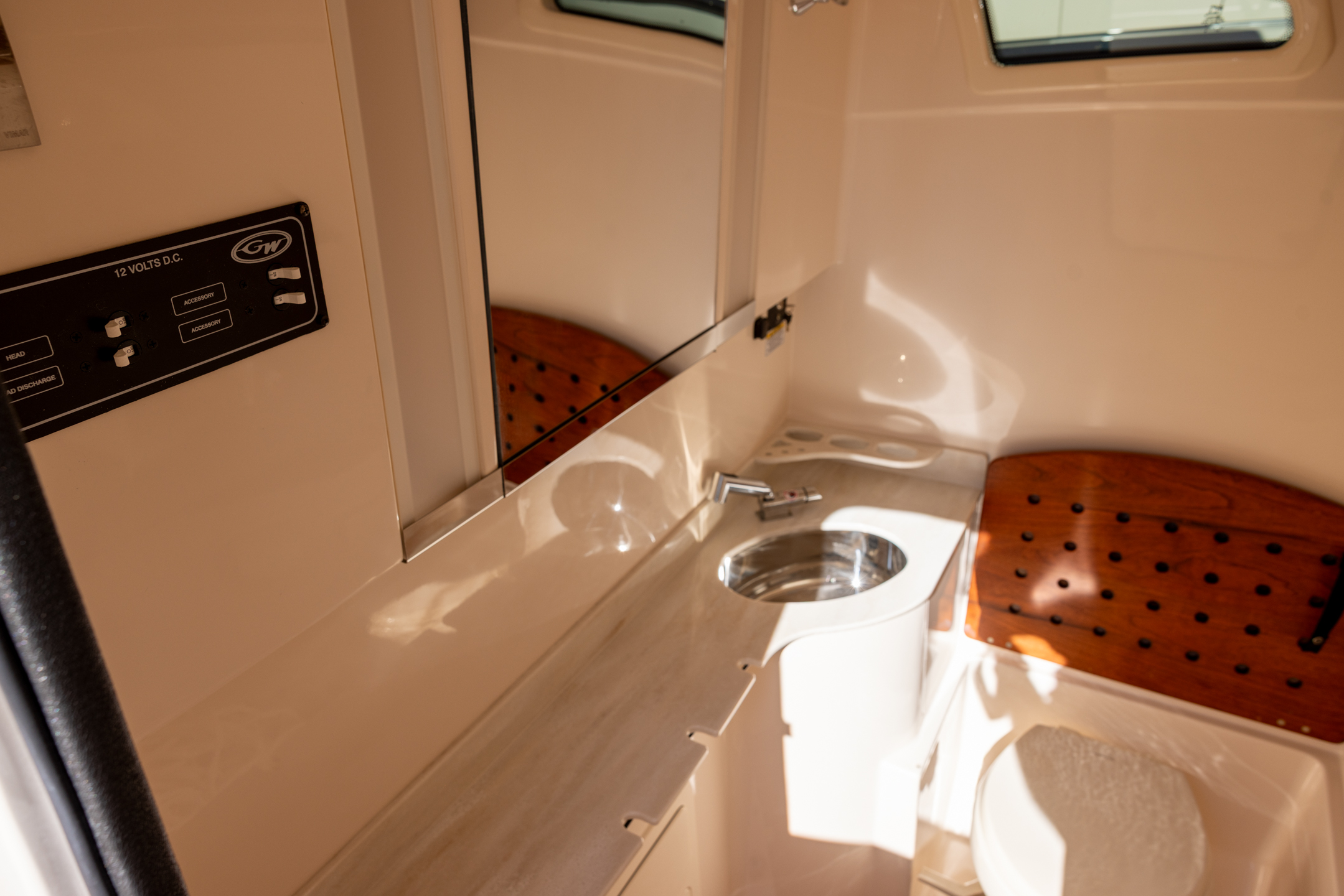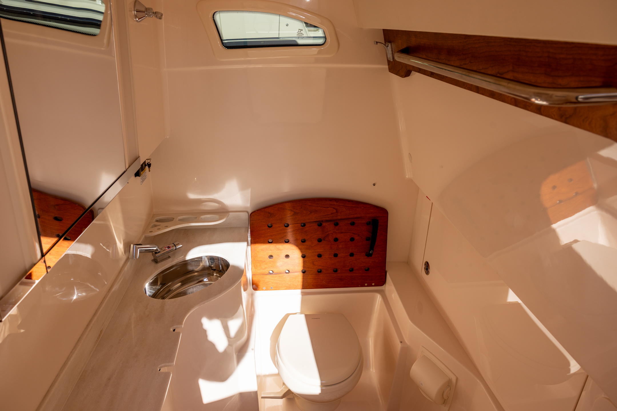 - Lockable Head console w/lighting, sink, bulk storage, VacuFlush head w/freshwater supply, 10-gallon holding tank, overboard discharge & deck pump out