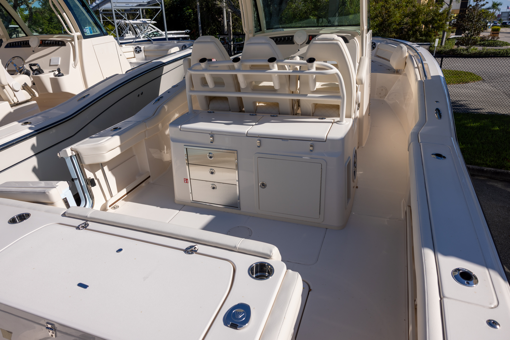 - Lean Bar Rigging station - freshwater sink w/faucet, Trash Bin, lockable storage drawers, lockable w/tackle trays and 4 Rod Holders