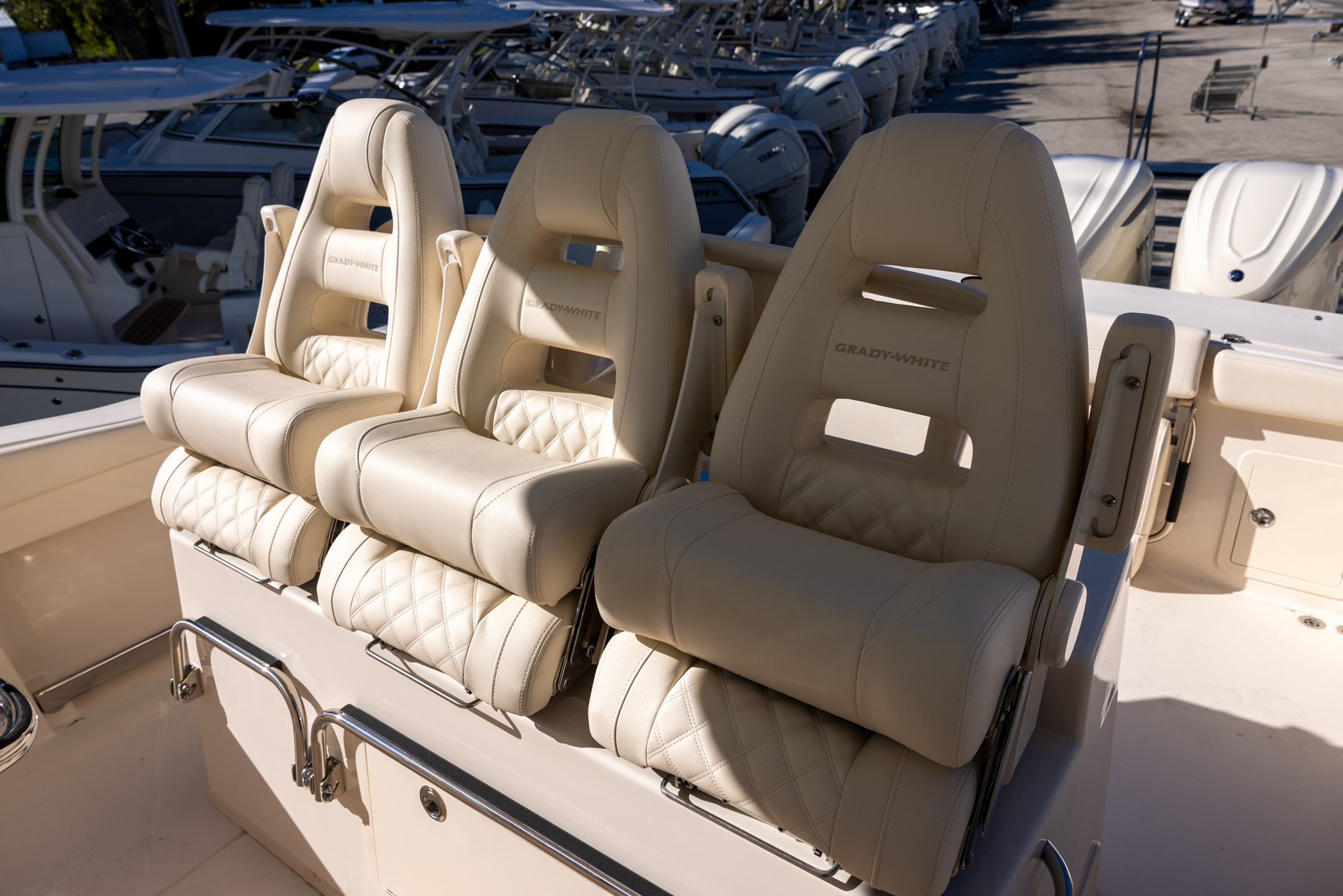 - Lean bar mounted Command Elite helm chairs (3) horizontally adjustable w/deluxe cushioning & flip-up bolsters