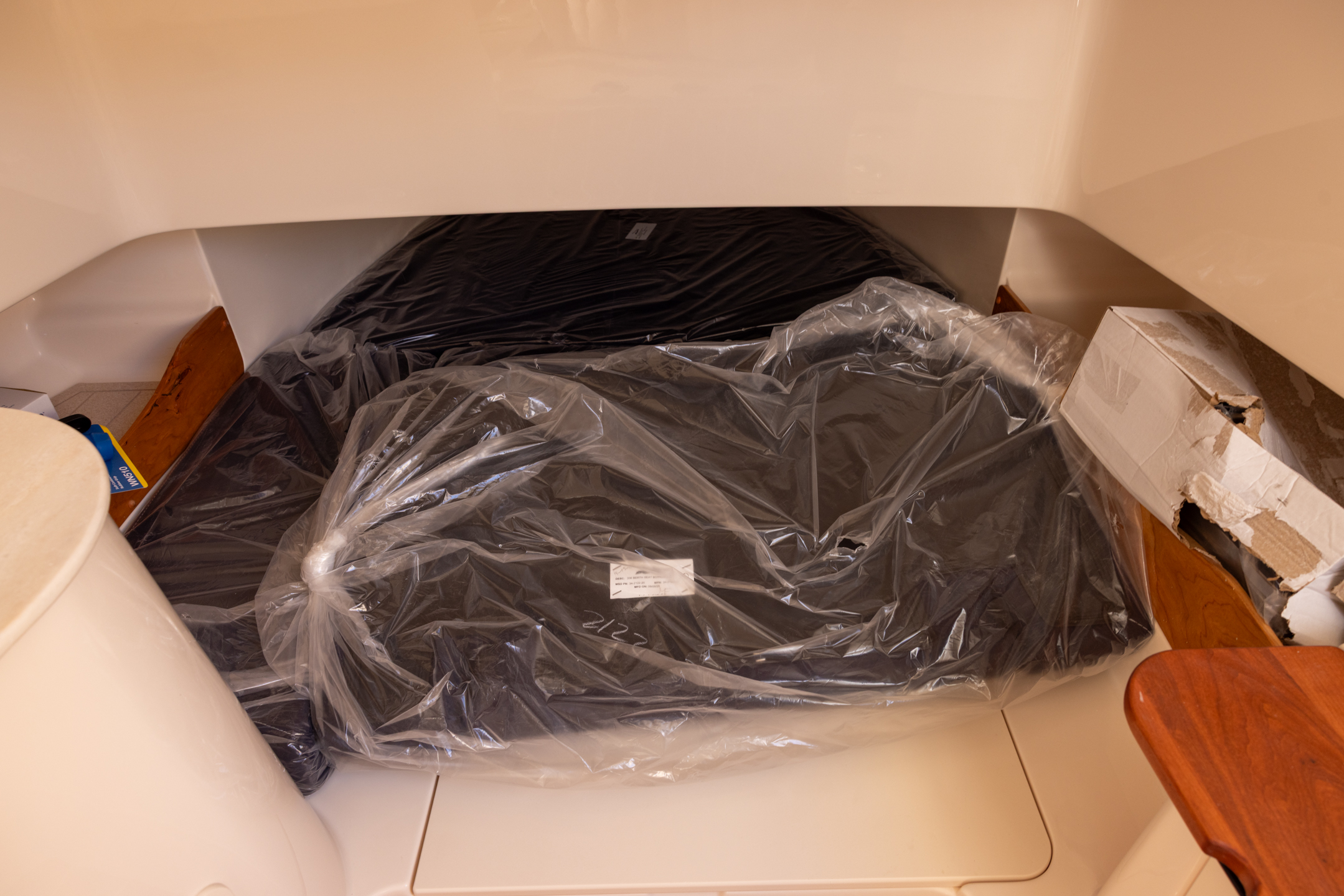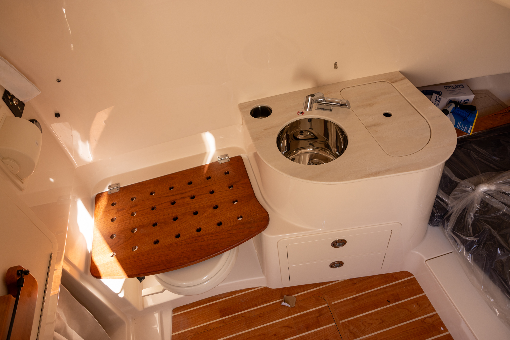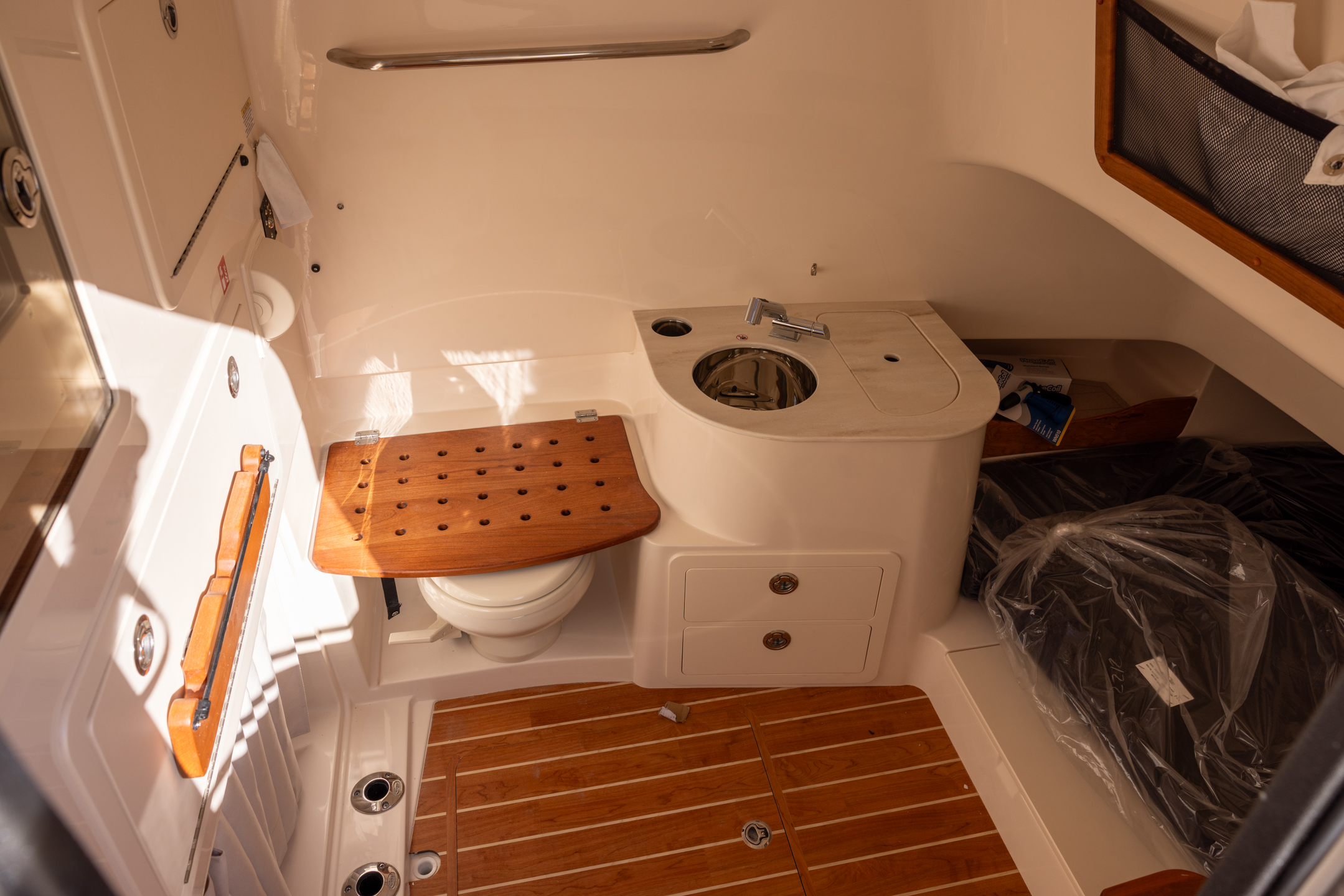 - lockable Head w/stand up head area, shower, CorianĀ® countertop with sink, drawers, fold down seat & VacuFlushĀ® head w/freshwater supply, 10-gallon holding tank, overboard discharge & deck pump out