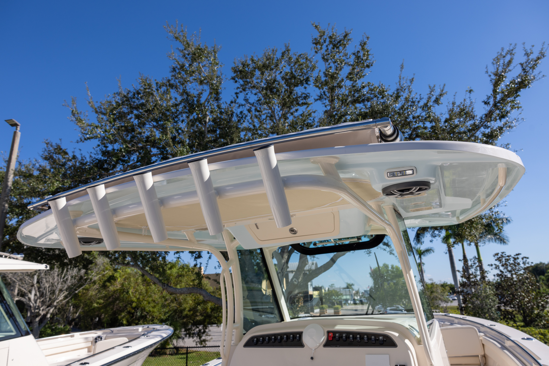 - Deluxe stereo system w/waterproof touch screen display, AM/FM tuner, Wi-Fi & BluetoothĀ® connectivity & helm subwoofer; speakers w/LED lights - bow (2), helm (2), T-top (2)
