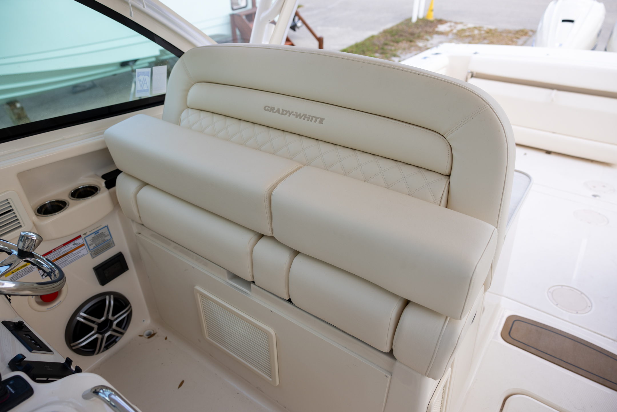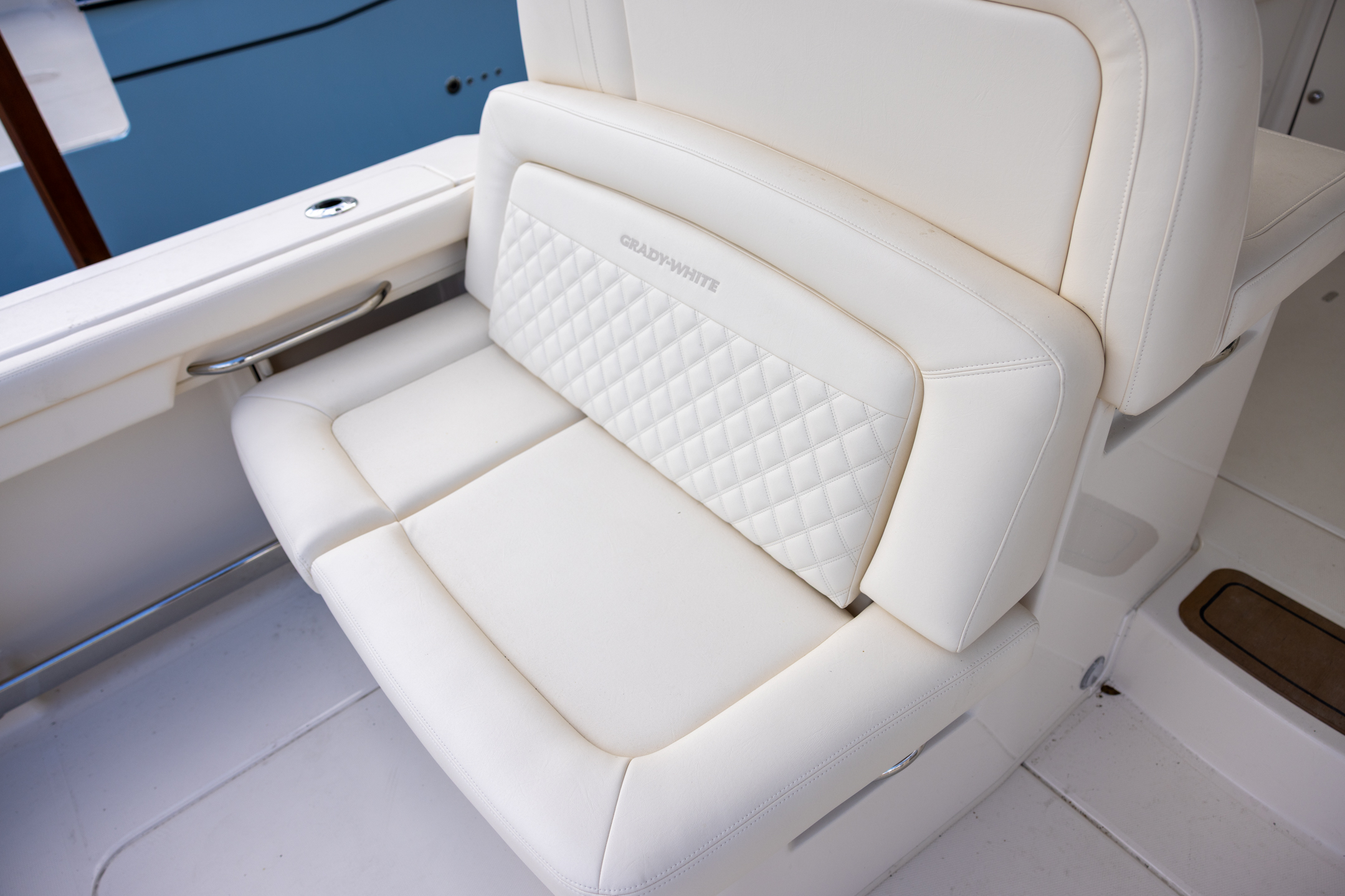 - Starboard console w/shower, sink, drawers, lighting, microwave, bulk storage, mirror w/vanity lighting, fold down seat w/cushion & VacuFlush® head w/freshwater supply, 10-gallon holding tank, overboard discharge & deck pump out