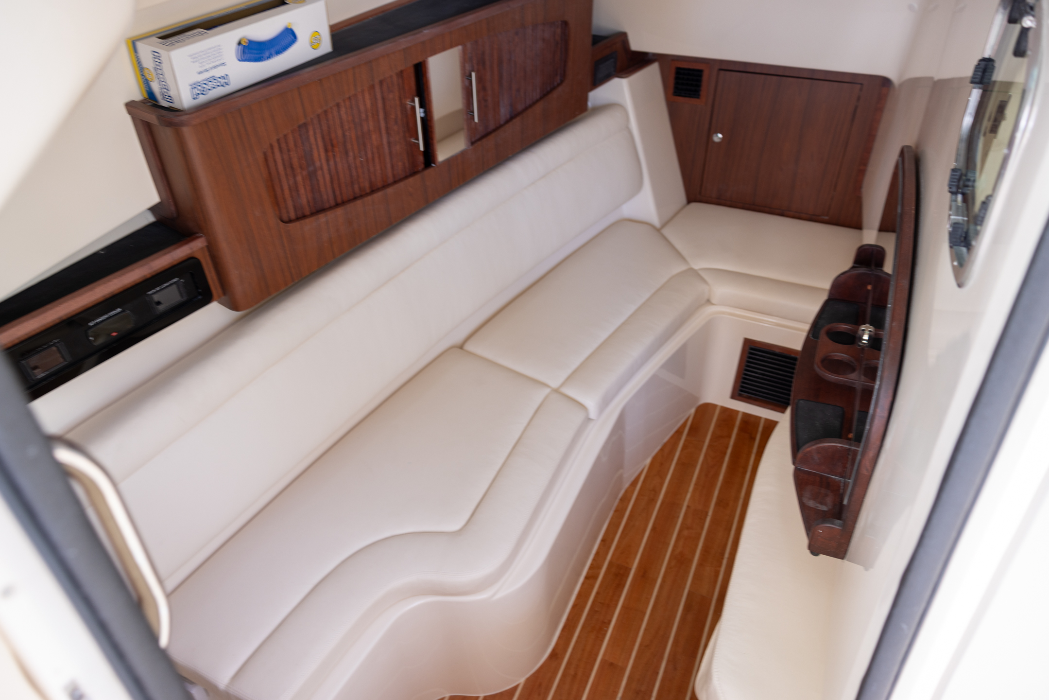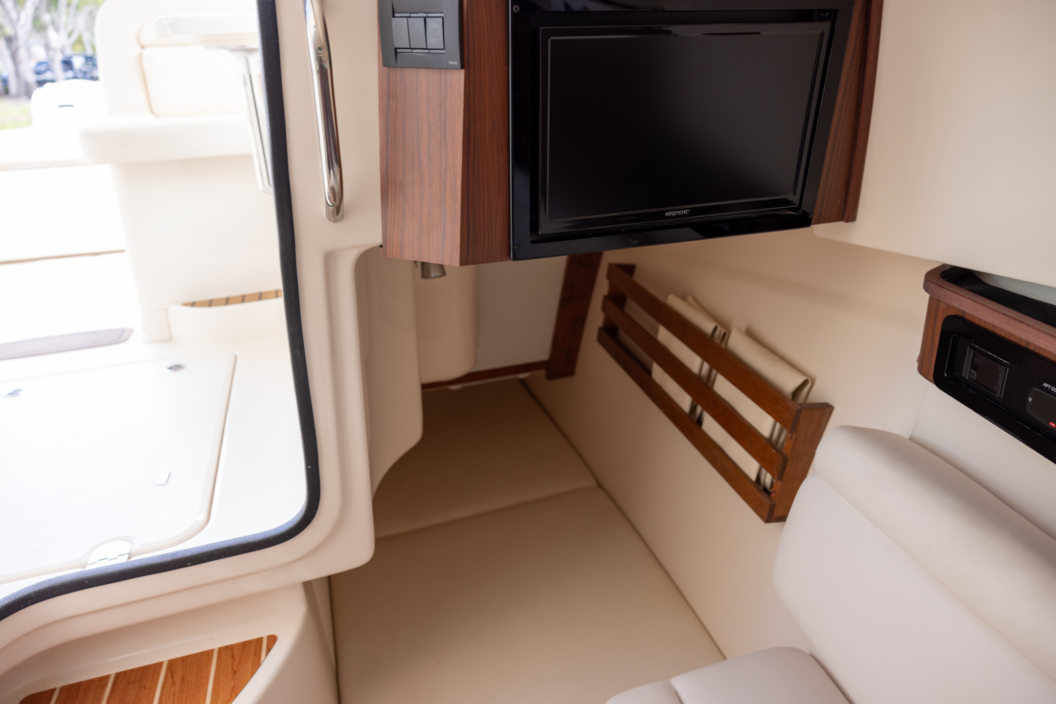 - Portside cabin console w/electromechanically adjustable sliding berth, aft berth, bench seat, cedar lined closet, drawers, flat screen 19" LED-LCD TV w/HDMI inlet, mirror, lighting, tinted screened window & bulk storage