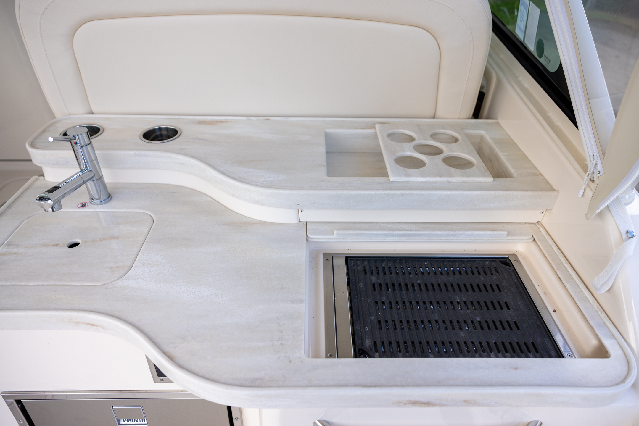- Wet bar w/1300W grill, refrigerator, sink, storage drawers, trash bin & drink holders (2) (integrated with electromechanically adjustable helm seat)