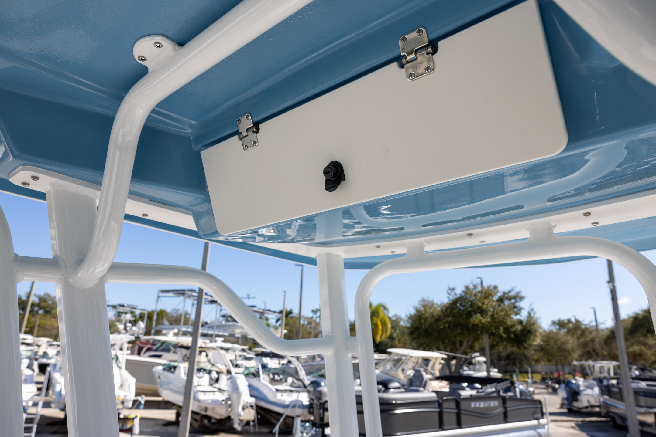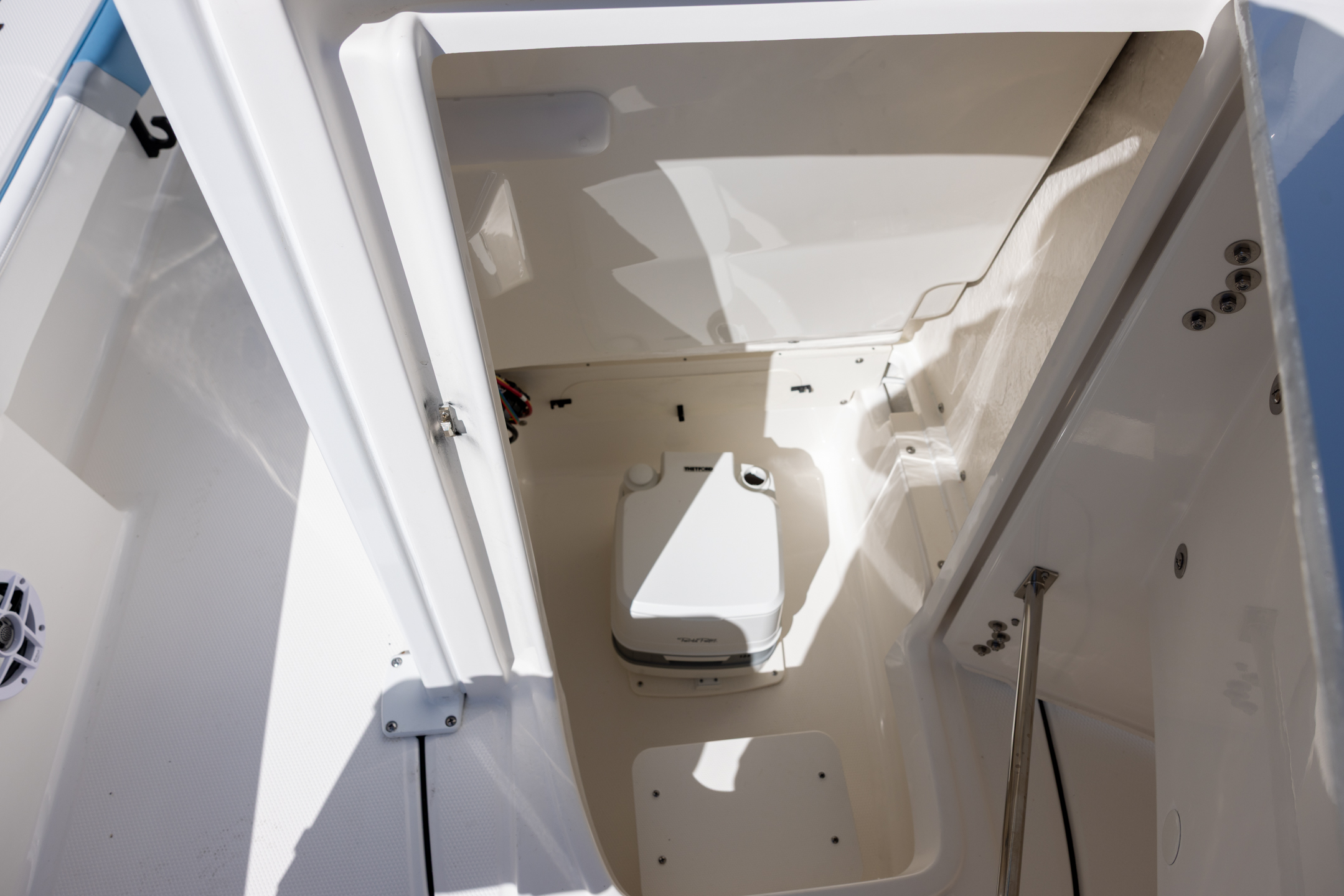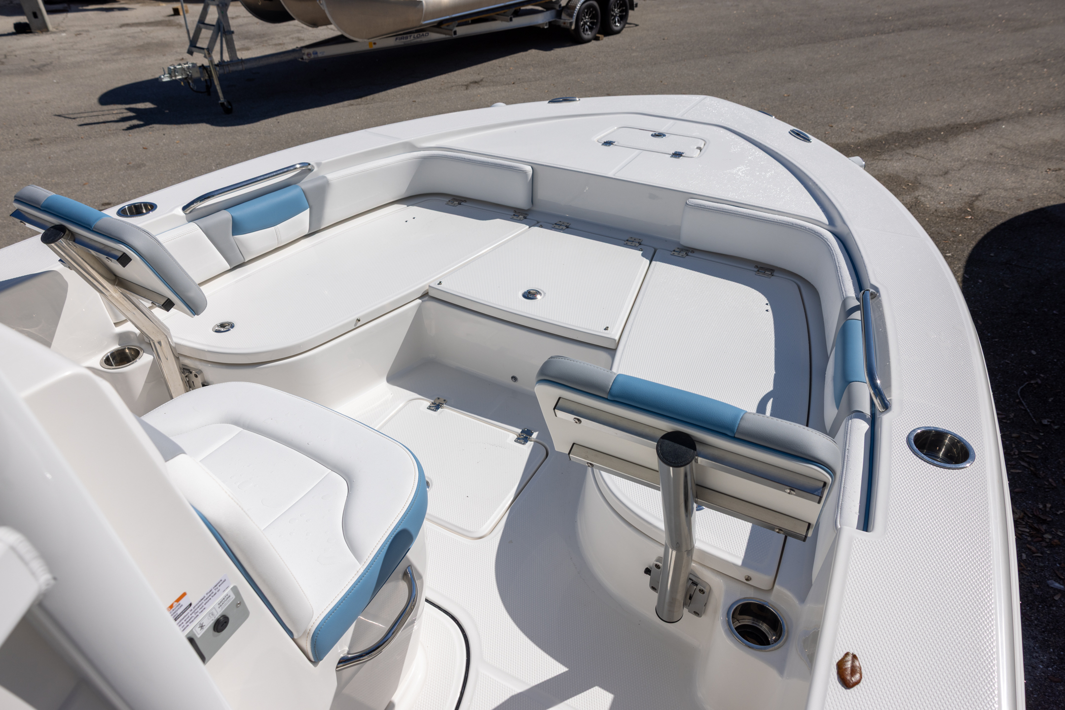 - Bow Center Insulated Livewell (20 gallons) with Dedicated Livewell Pump, LED lighting, Blue Gelcoat Finish with Adjustable Flow Valve