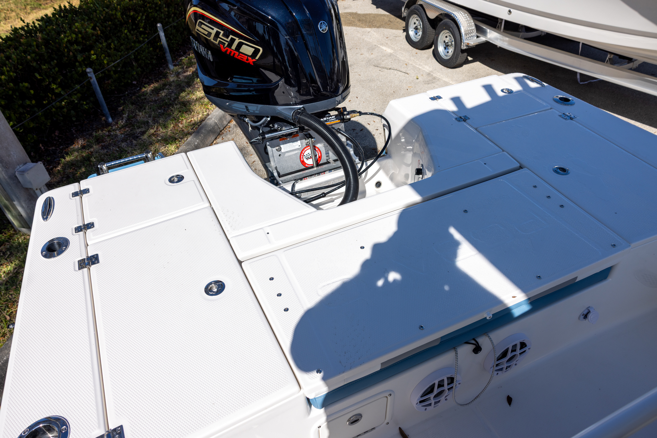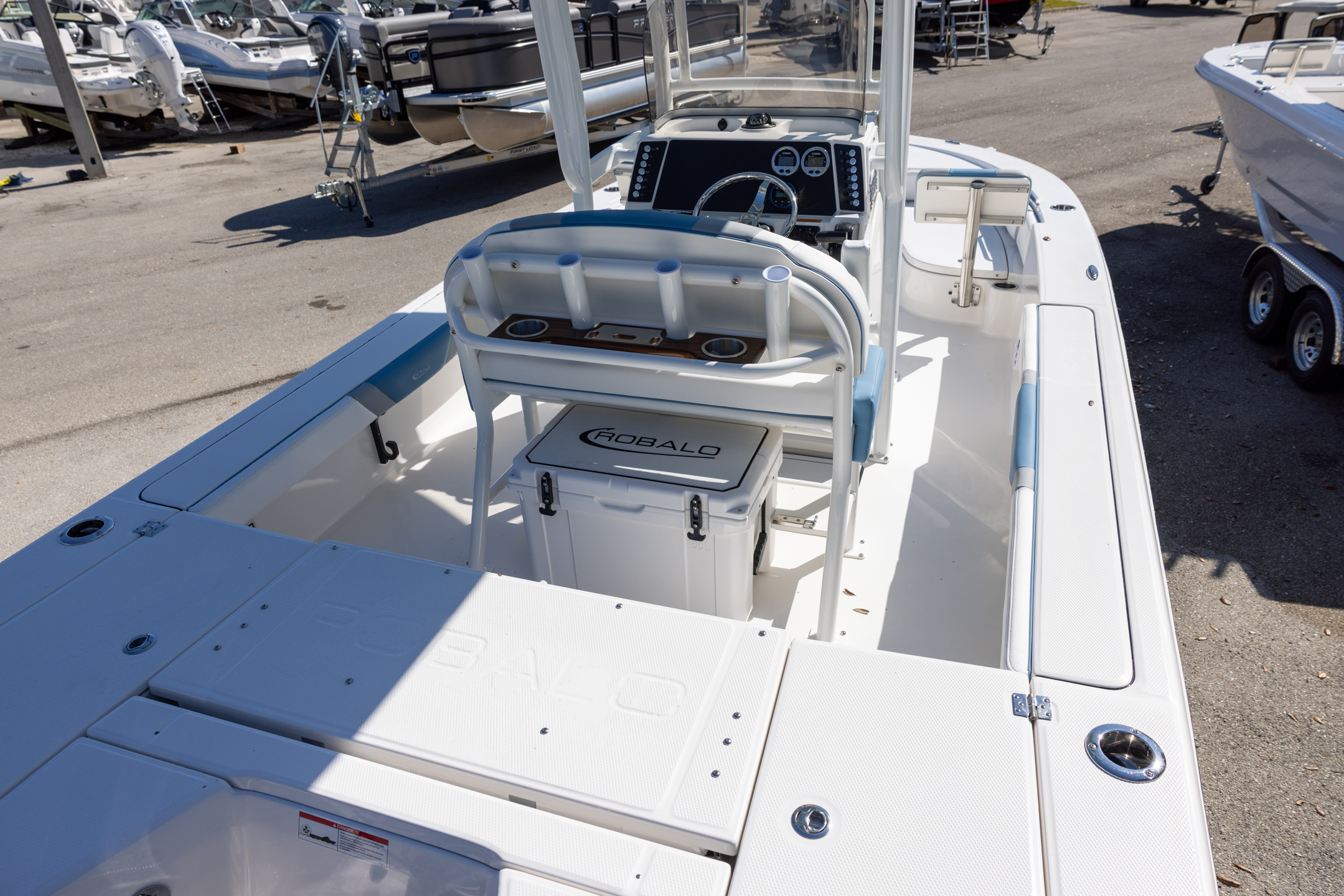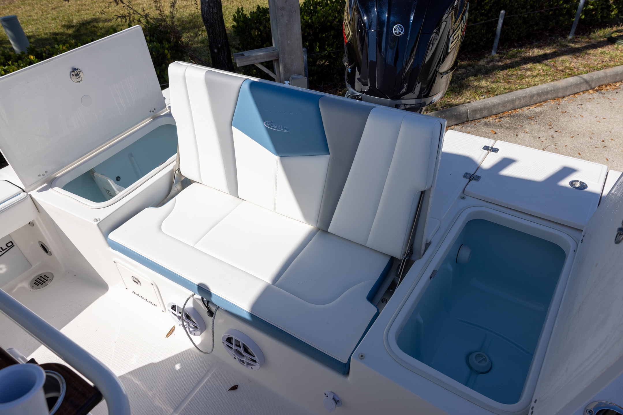 - Twin Aft Insulated Livewell/Fish Boxes (30 gallons) with Dedicated Livewell Pumps, LED lighting, Blue Gelcoat Finish, Adjustable Flow Valves and Plexiglass Divider