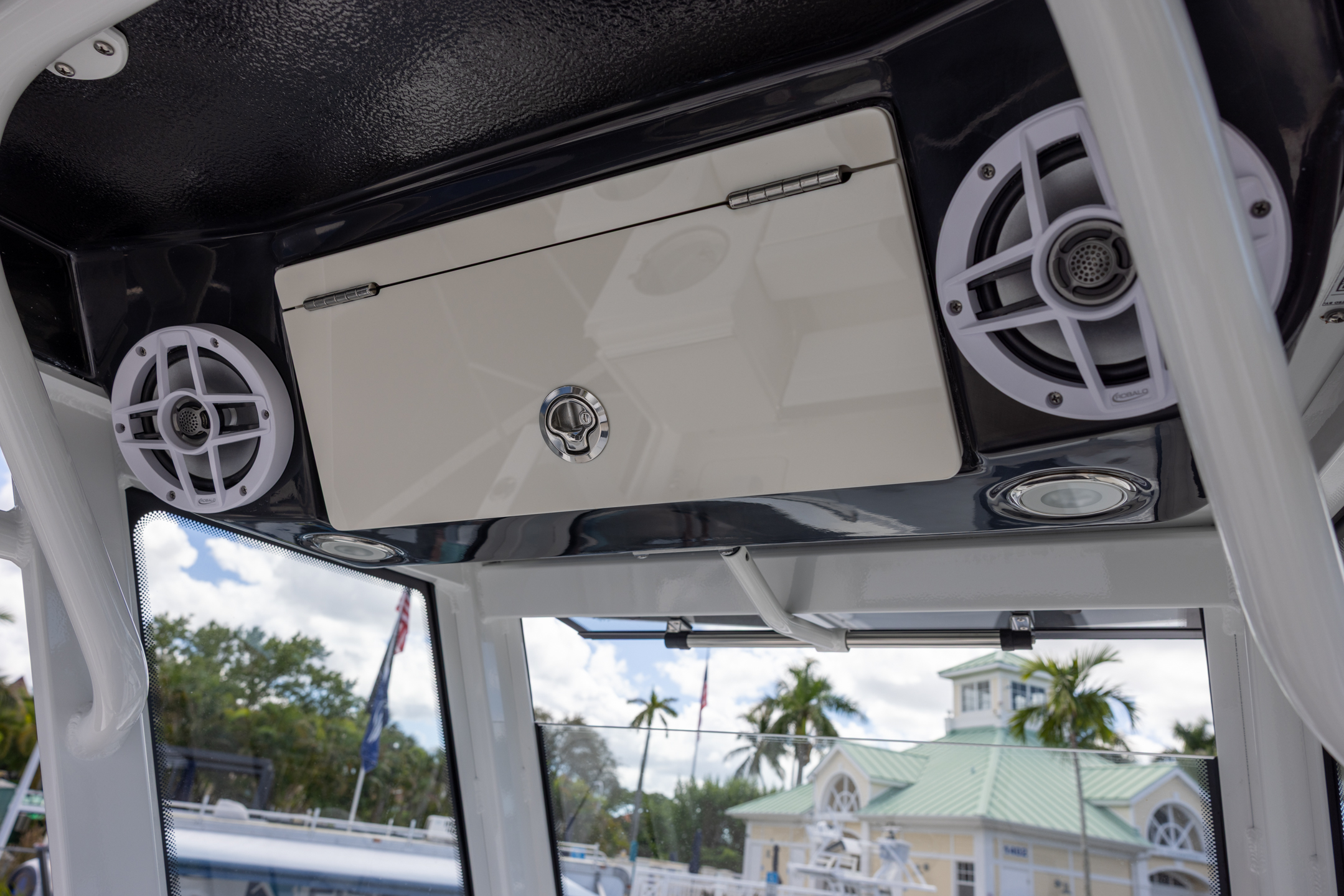 - Fiberglass Hardtop with Powder Coated Frame (Black or White) Includes: 4 Rod Holders, Electronics Box, LED Spreader Lights and (2) Speakers