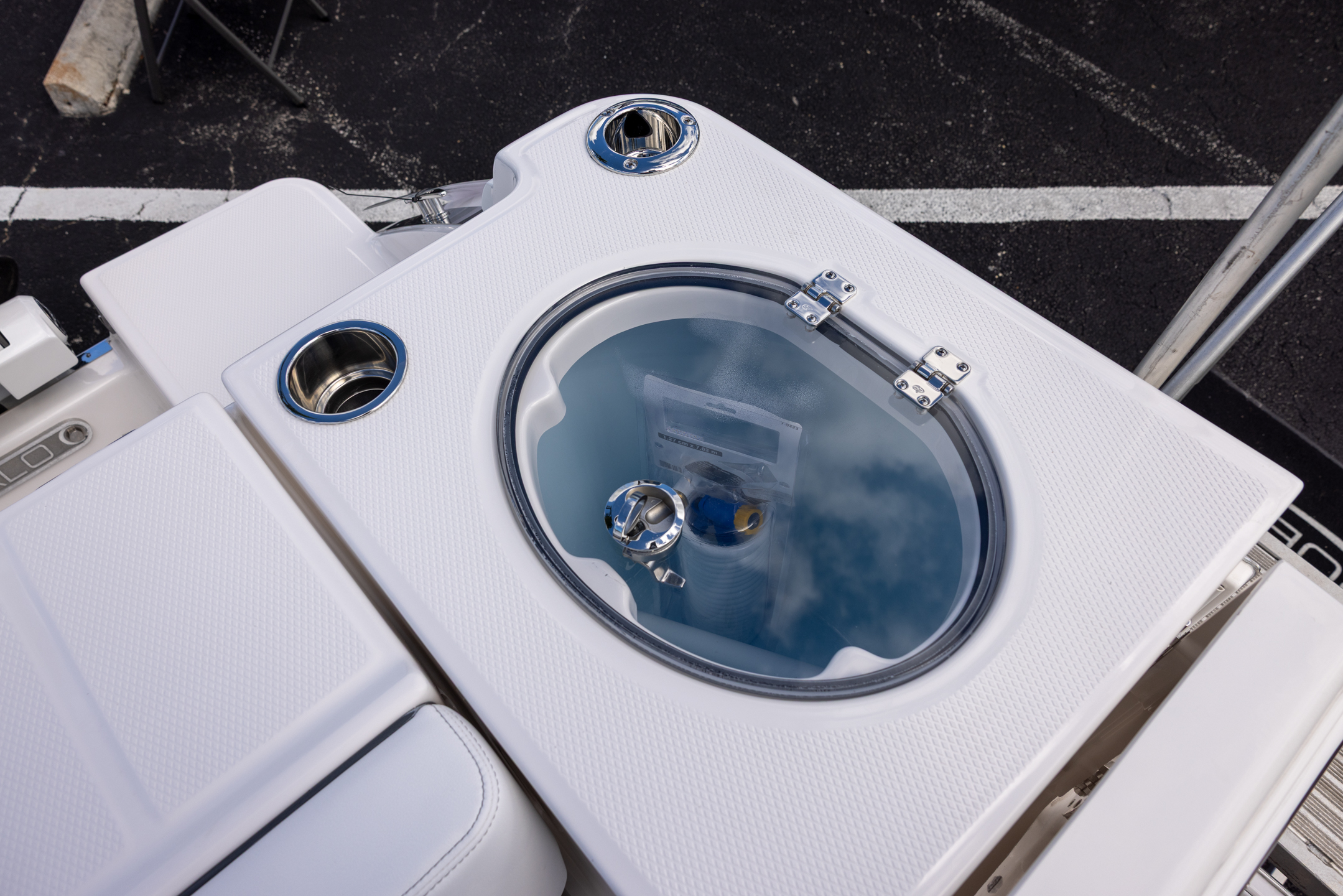 - Port Aft Insulated Livewell (30 Gallons) with LED Lighting, Blue Gelcoat Finish and Adjustable Flow Valve