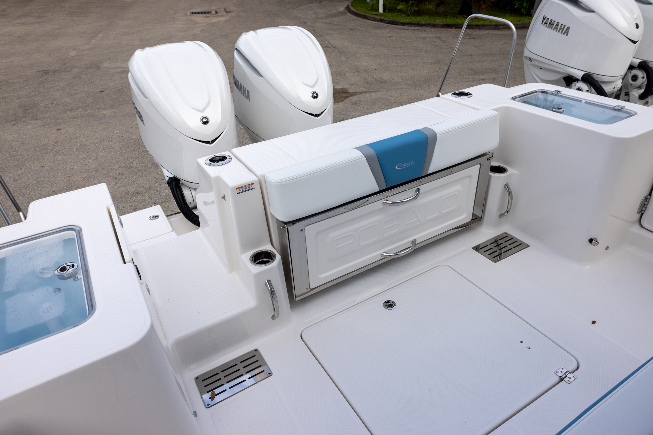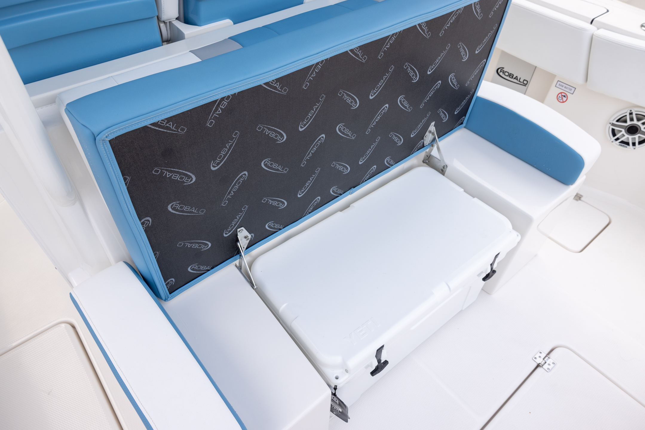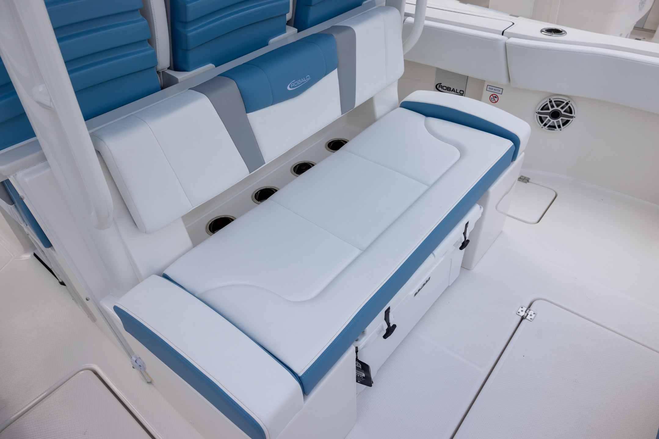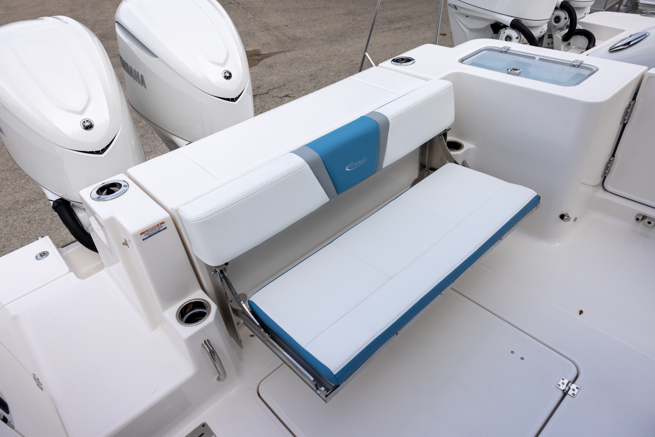 - Aft Facing Bench Seat with Stainless Steel Drink Holders and Carry On 65 Qt Yeti Cooler