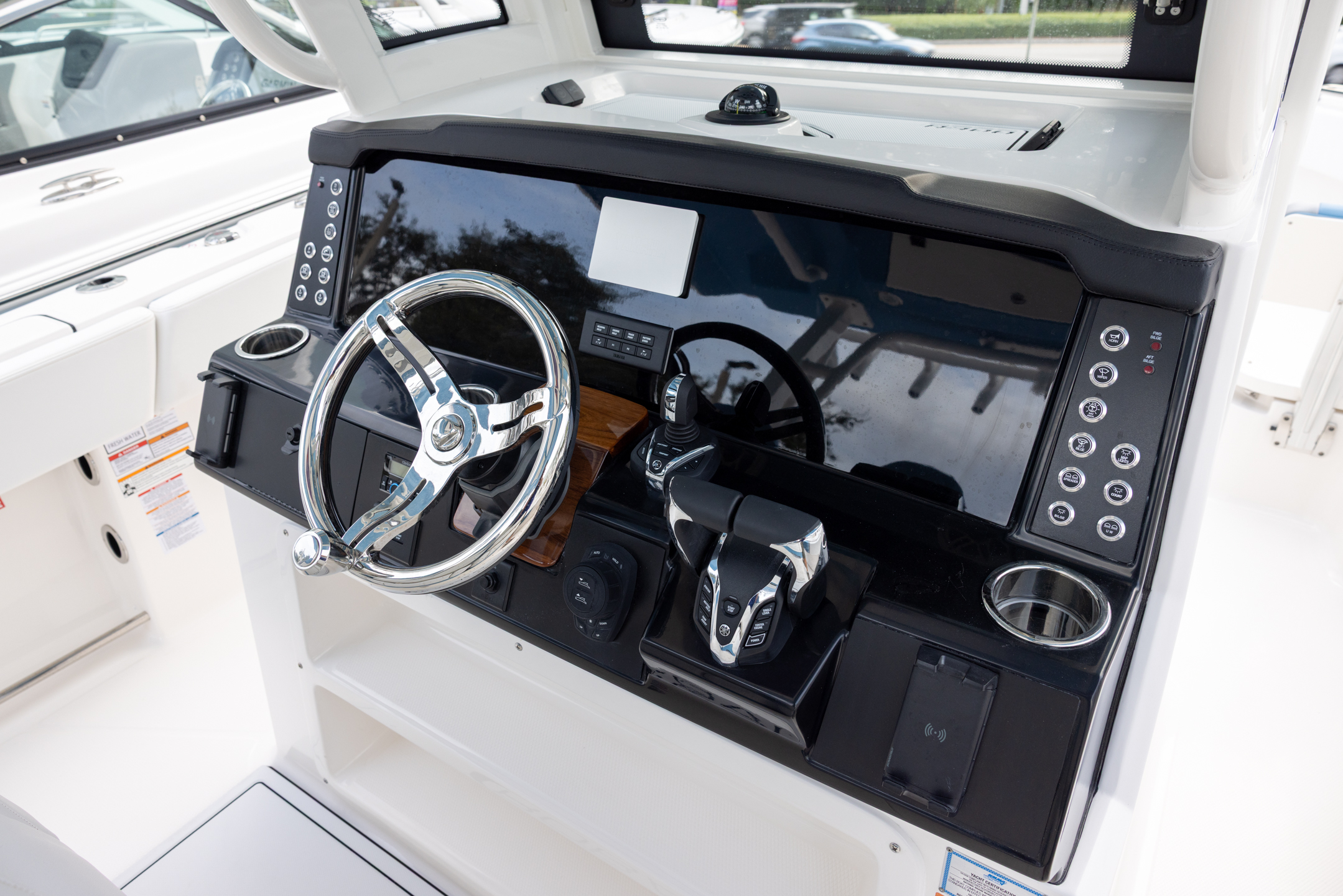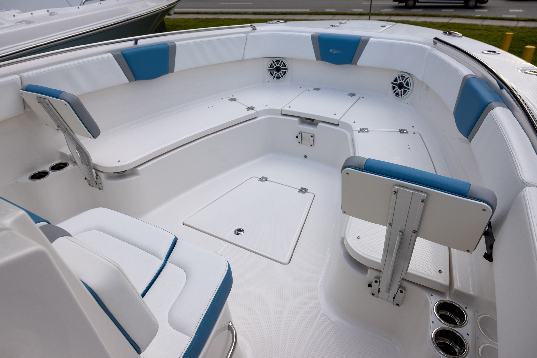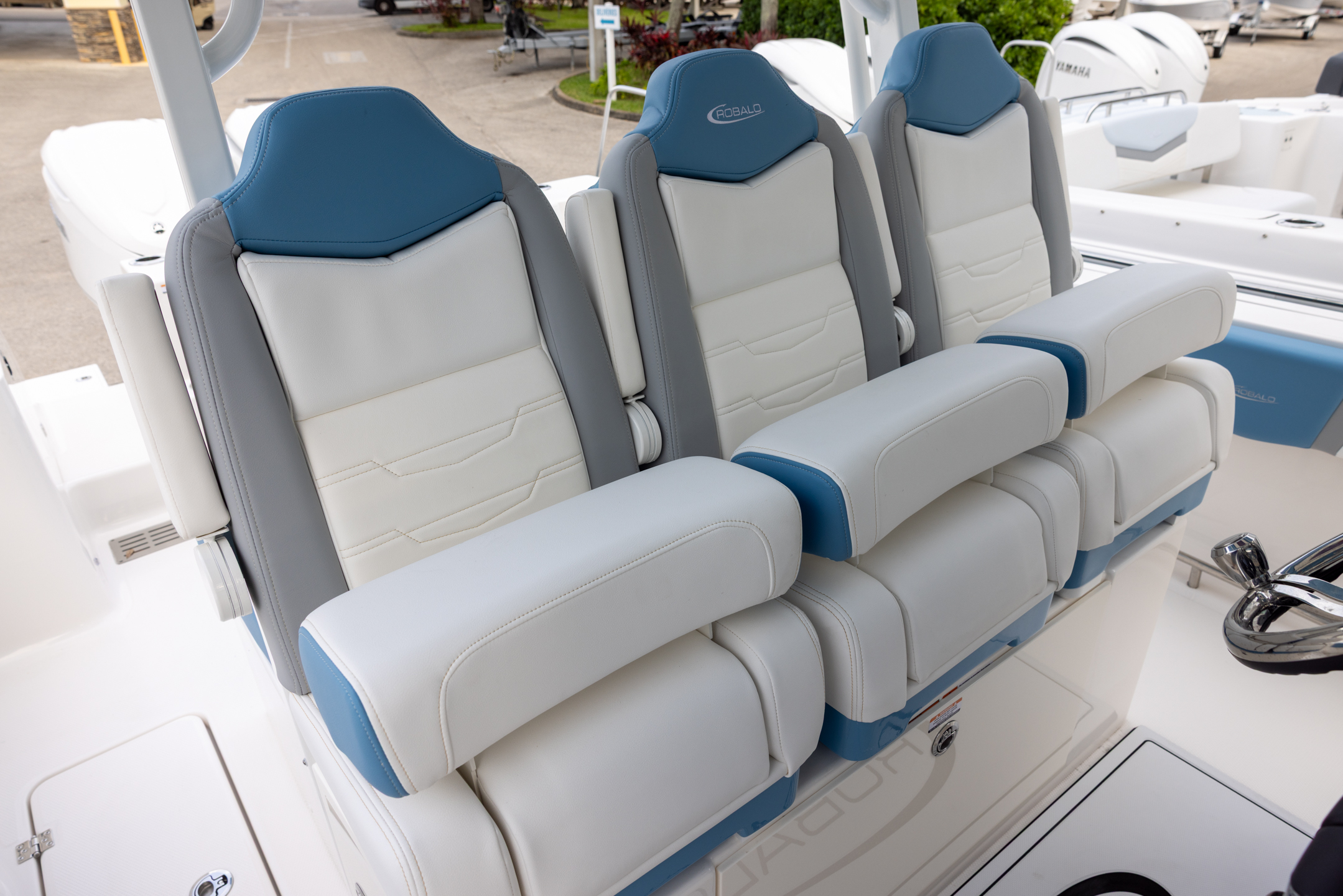 - Triple Forward Facing Helm Seats w/ Flip-Up Bolsters and Fold Down Armrests (Includes Center Seat Electric Forward/Aft Control)