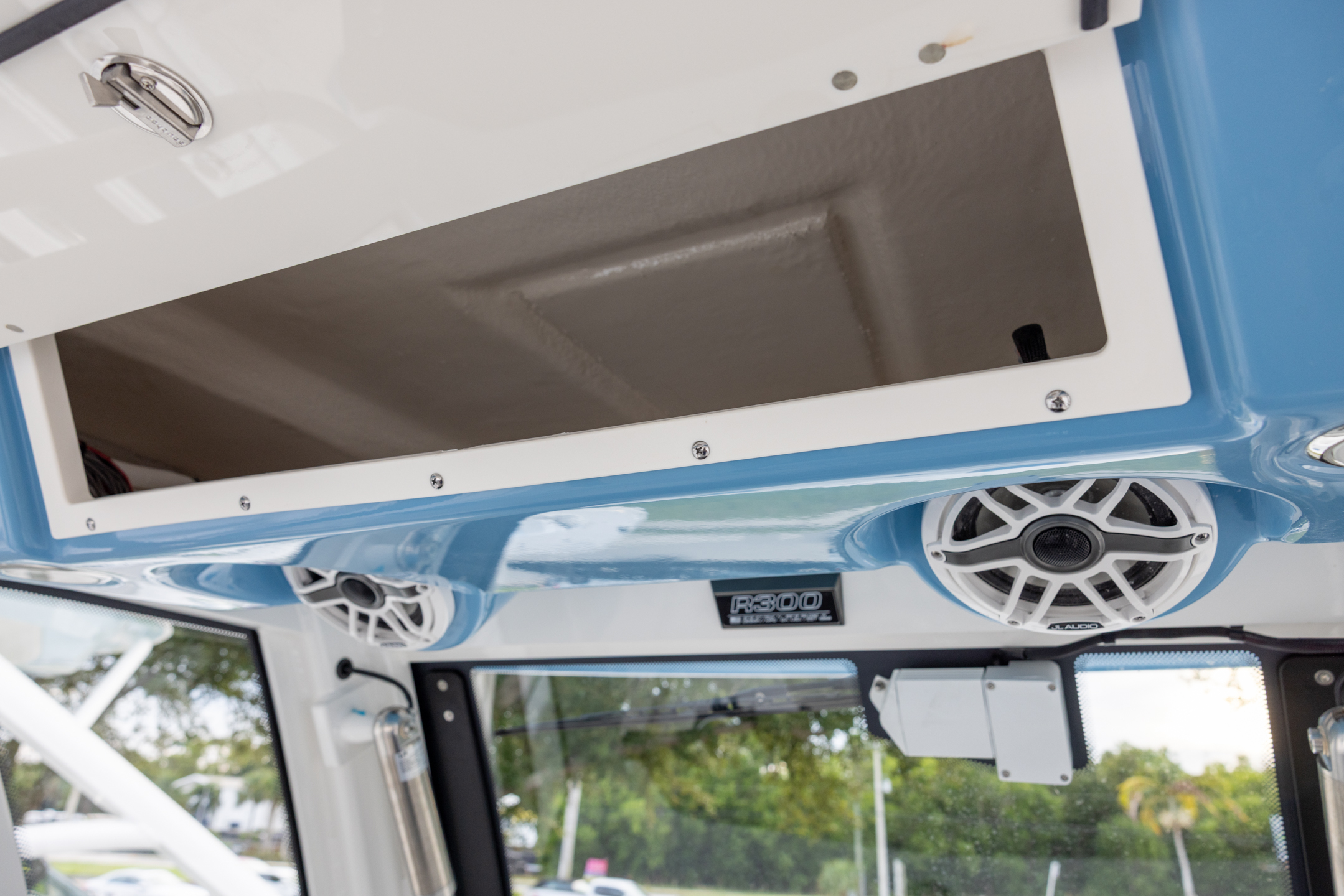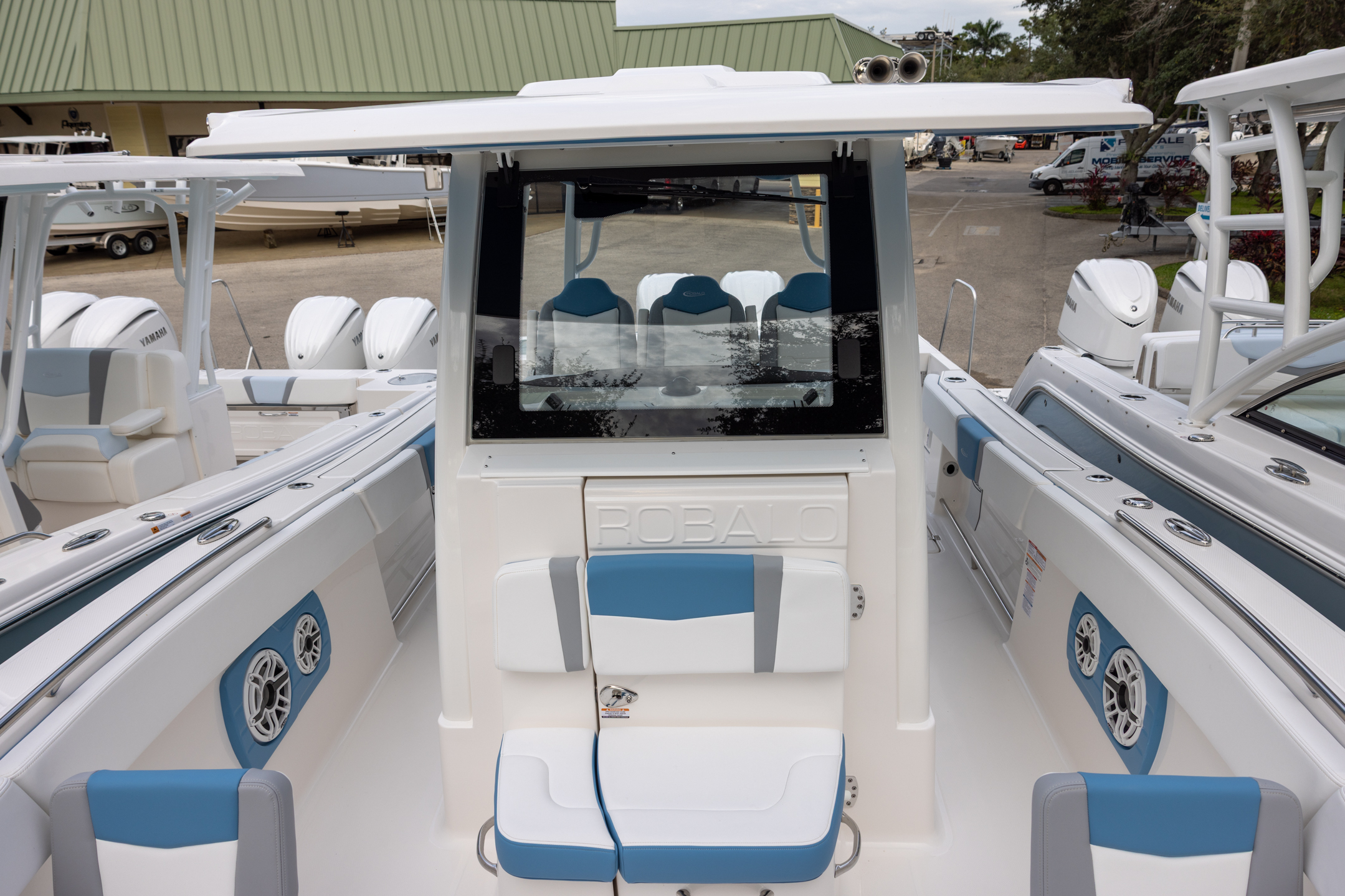 - Fiberglass Hardtop with Custom Powder Coated Frame (Black or White) Includes: Overhead Sky Light, Rod Holders (8), Electronics Box, Tri Color Map Lights (4), Spreader Lights with Dual Color (White and Blue - Dimmable) (5), Blue Overhead Courtesy Lighting, Speakers (2), Fresh Water Washdown Shower, and LED Cast Robalo Logo