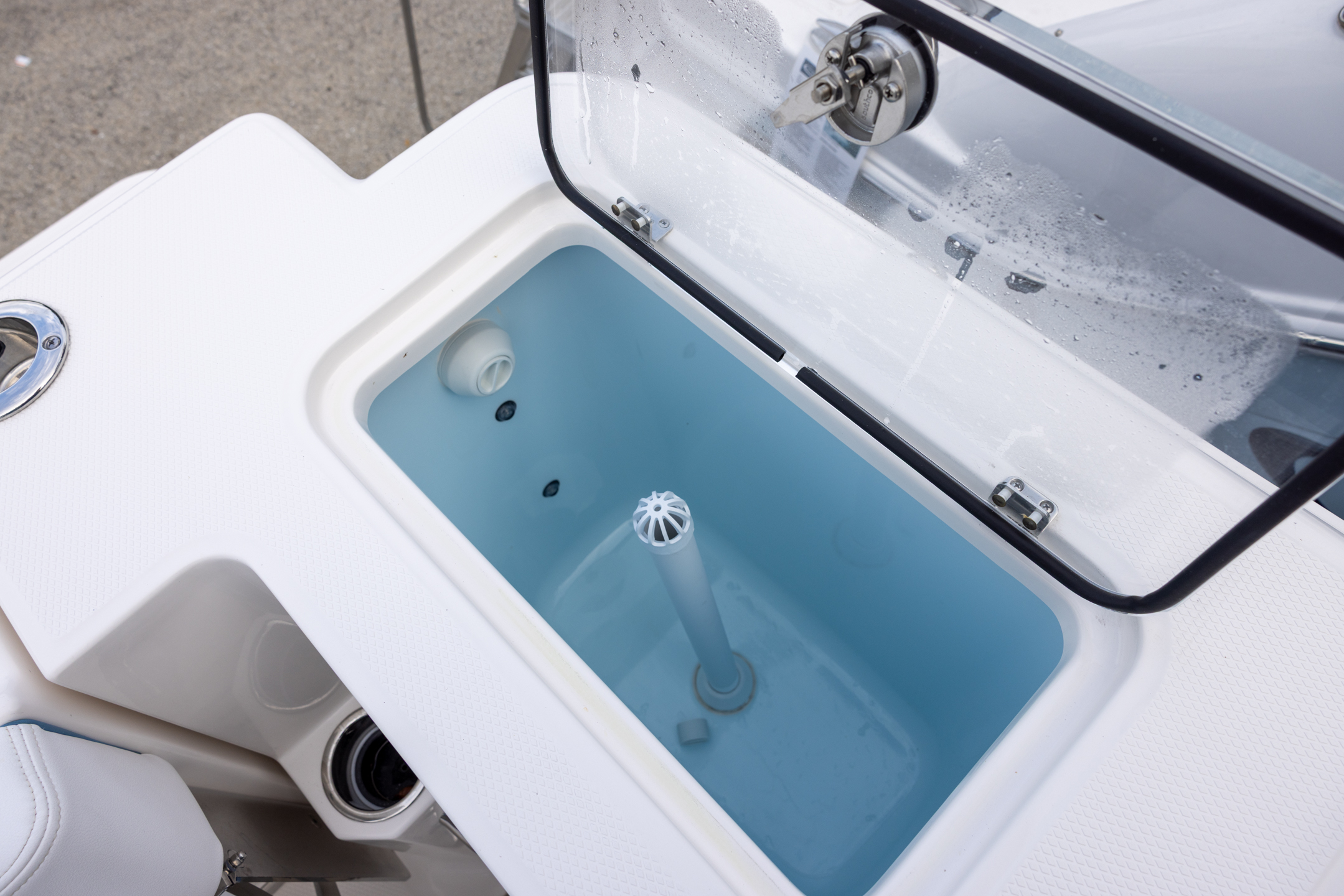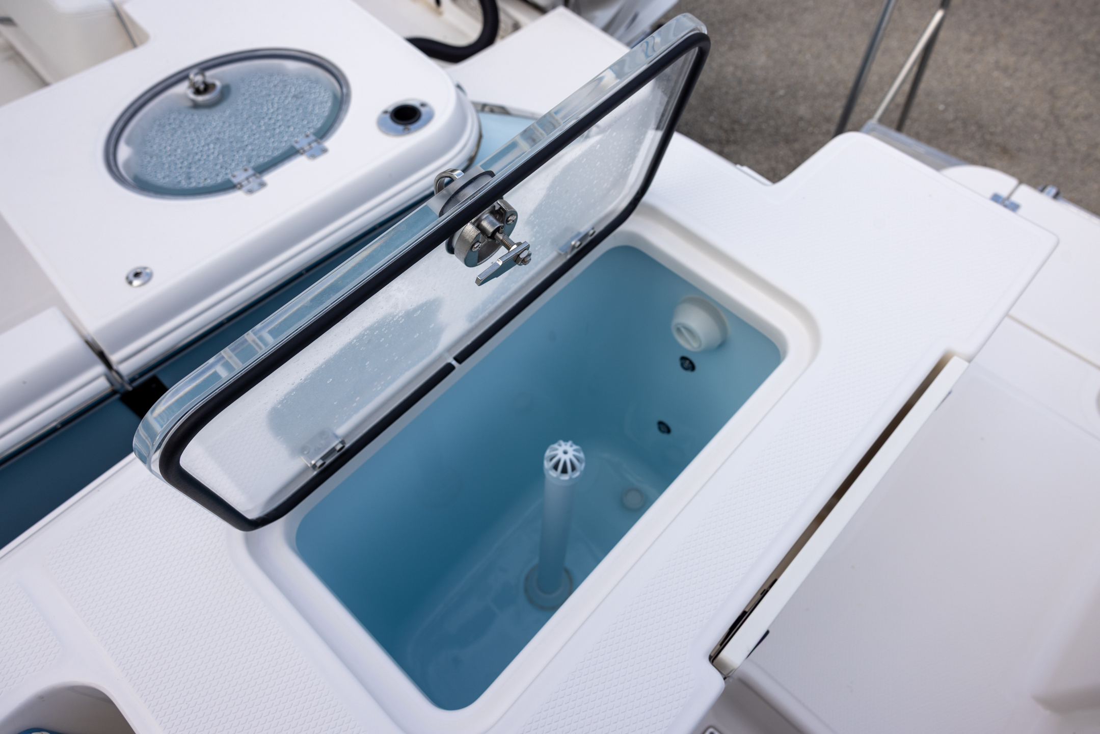- Twin Insulated Livewells (28 Gallons) with Specific Livewell Pumps, LED Lighting, Blue Gelcoat Finish, Adjustable Flow Valves, and Clear Plexiglass Lids