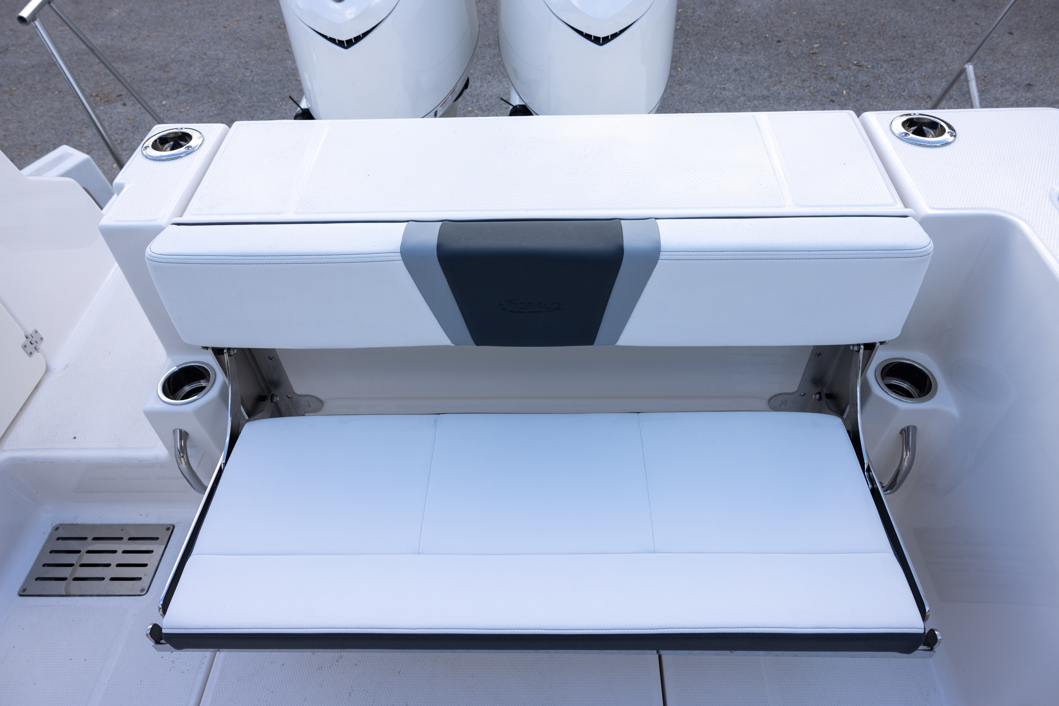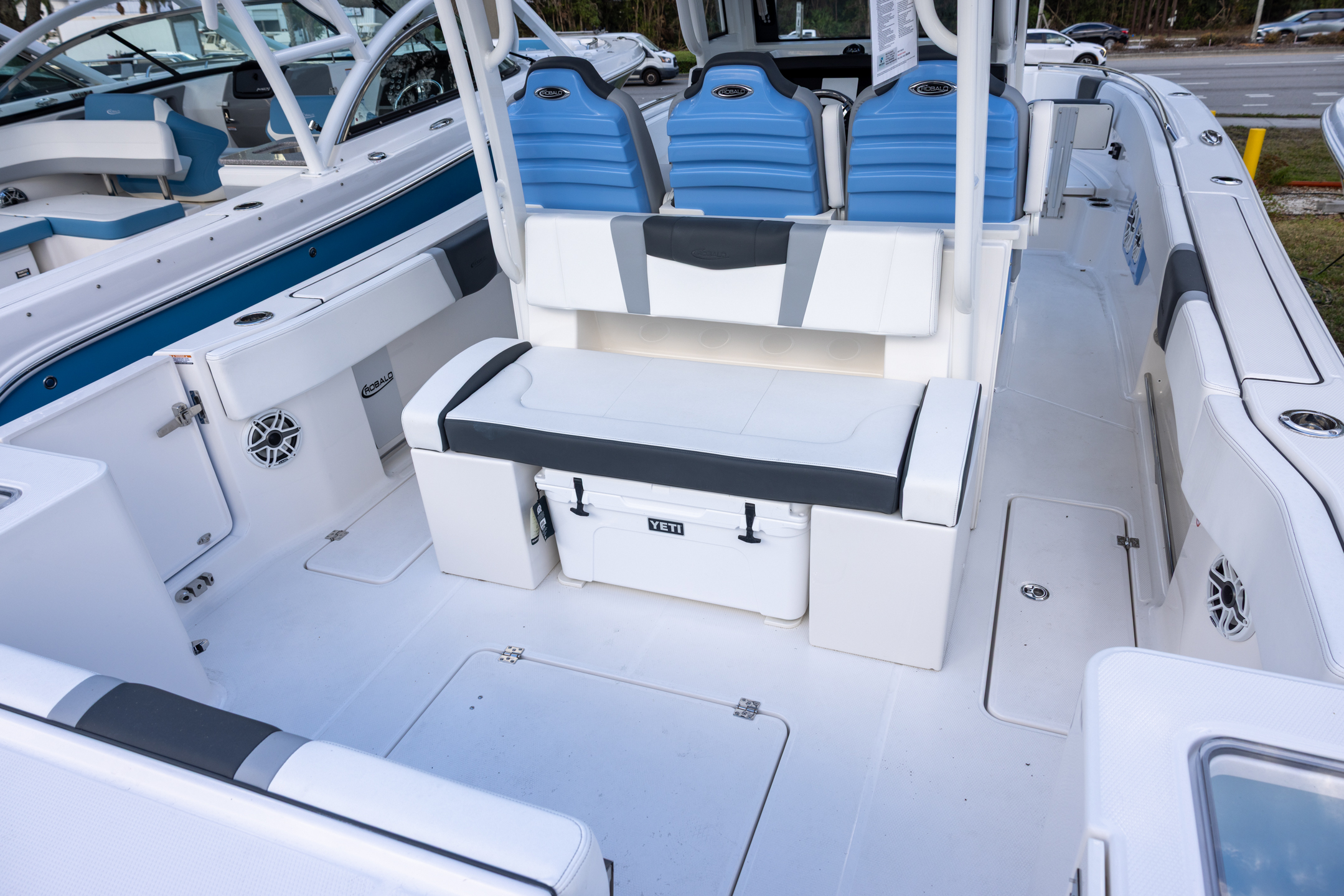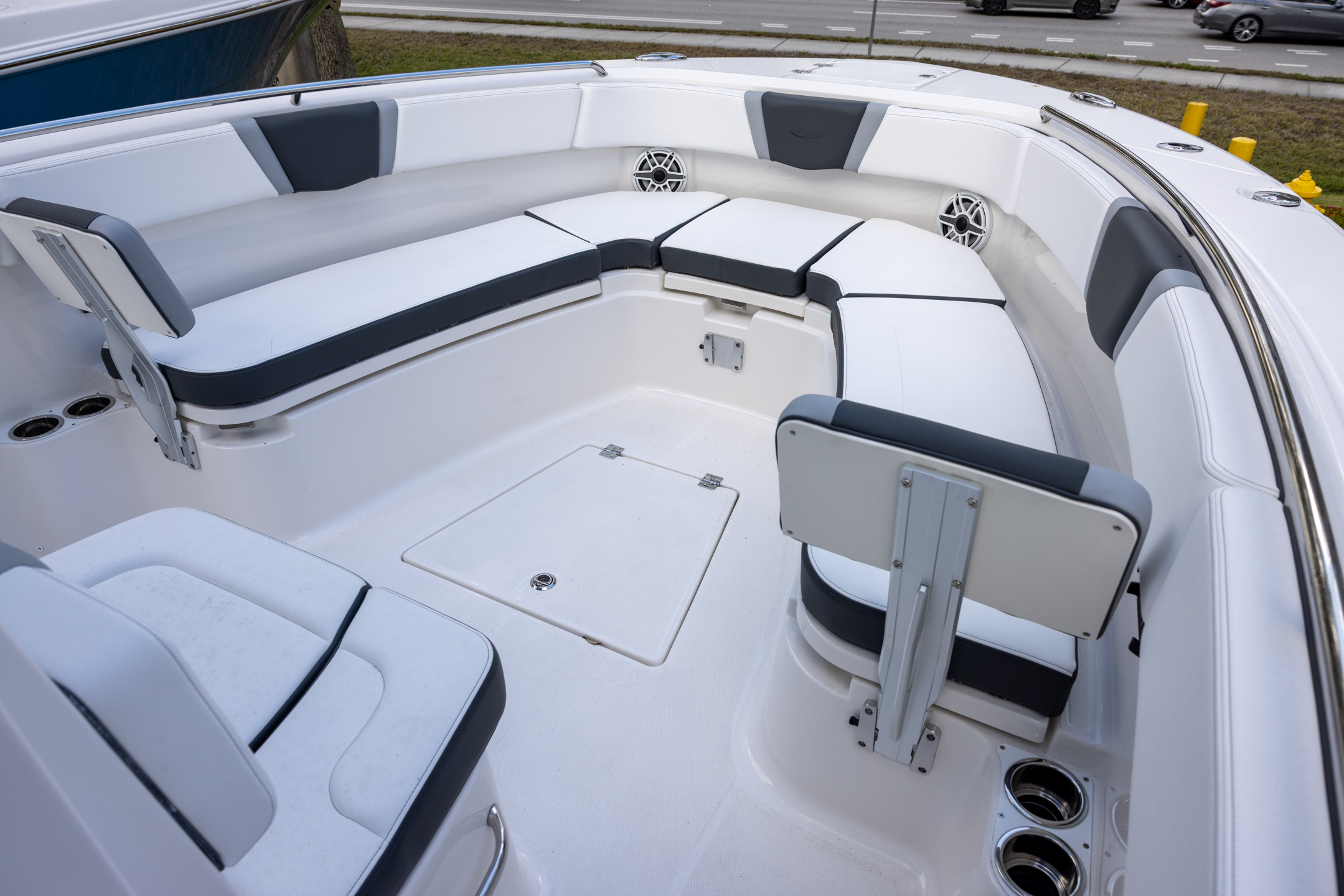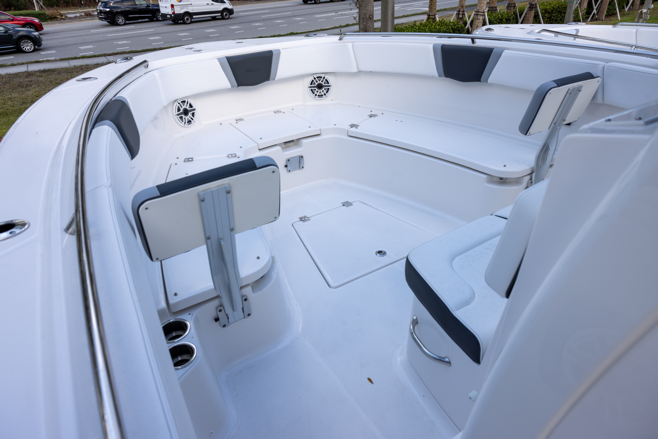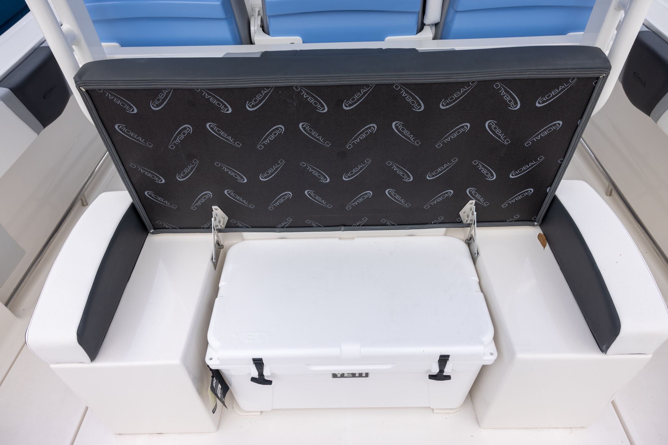 - Aft Facing Bench Seat with Stainless Steel Drink Holders and Carry On 65 Qt Yeti Cooler