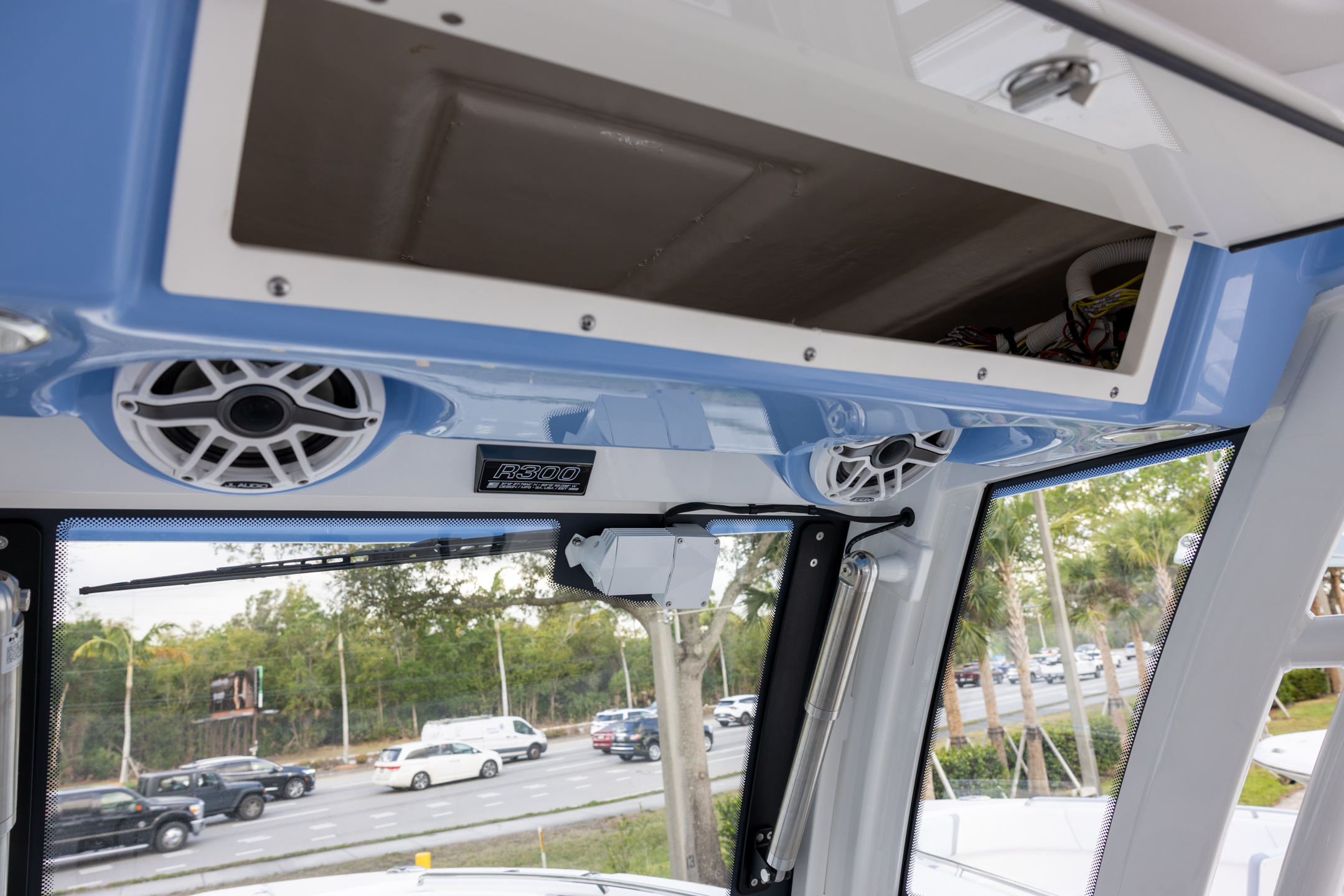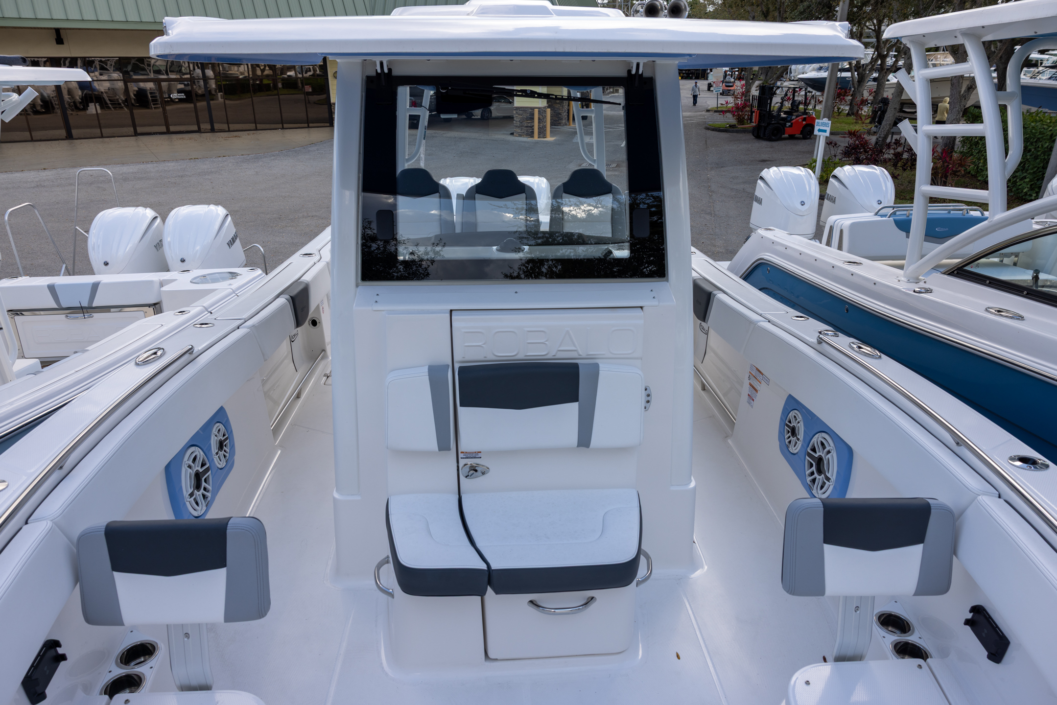 - Fiberglass Hardtop with Custom Powder Coated Frame (Black or White) Includes: Overhead Sky Light, Rod Holders (8), Electronics Box, Tri Color Map Lights (4), Spreader Lights with Dual Color (White and Blue - Dimmable) (5), Blue Overhead Courtesy Lighting, Speakers (2), Fresh Water Washdown Shower, and LED Cast Robalo Logo