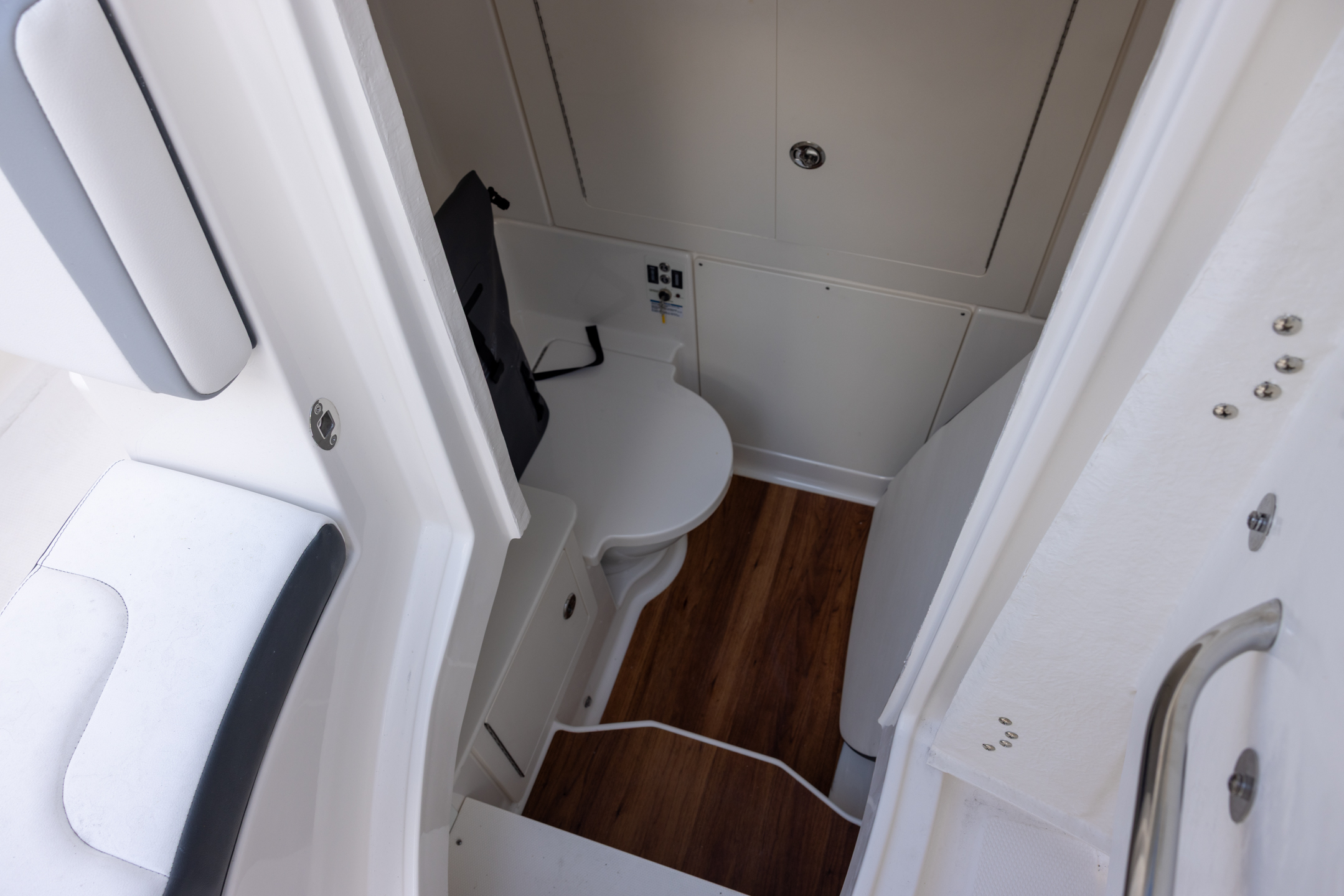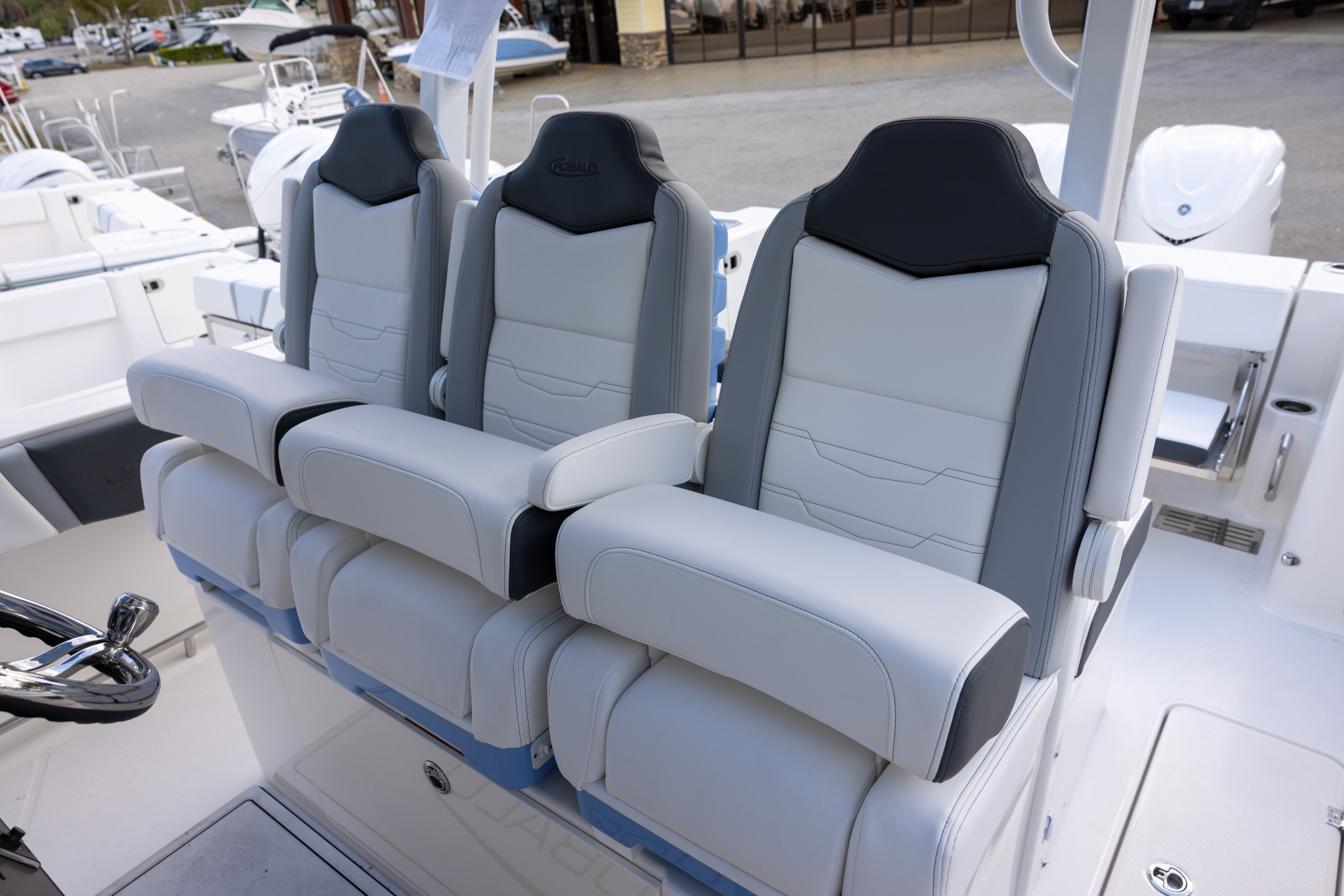 - Triple Forward Facing Helm Seats w/ Flip-Up Bolsters and Fold Down Armrests (Includes Center Seat Electric Forward/Aft Control)