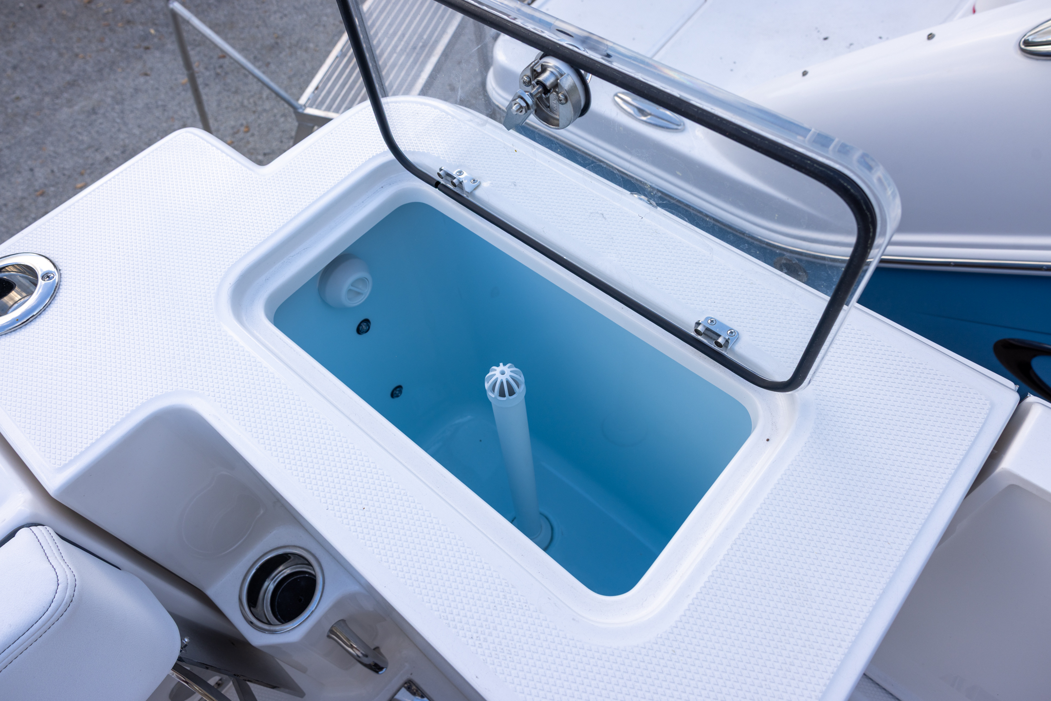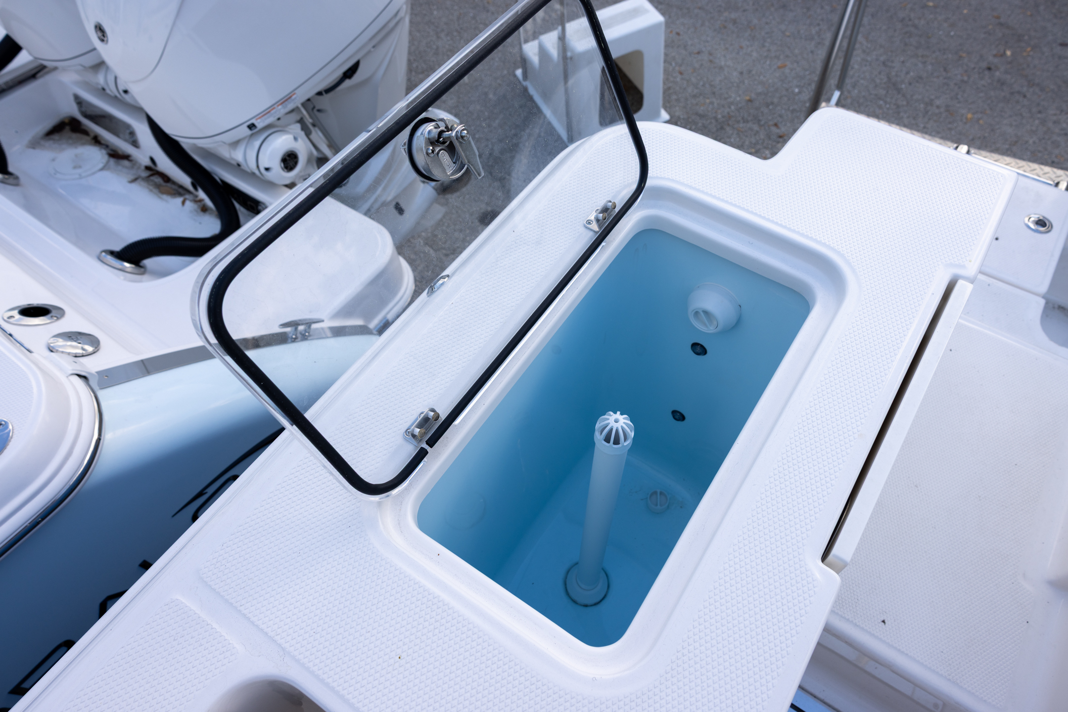 - Twin Insulated Livewells (28 Gallons) with Specific Livewell Pumps, LED Lighting, Blue Gelcoat Finish, Adjustable Flow Valves, and Clear Plexiglass Lids