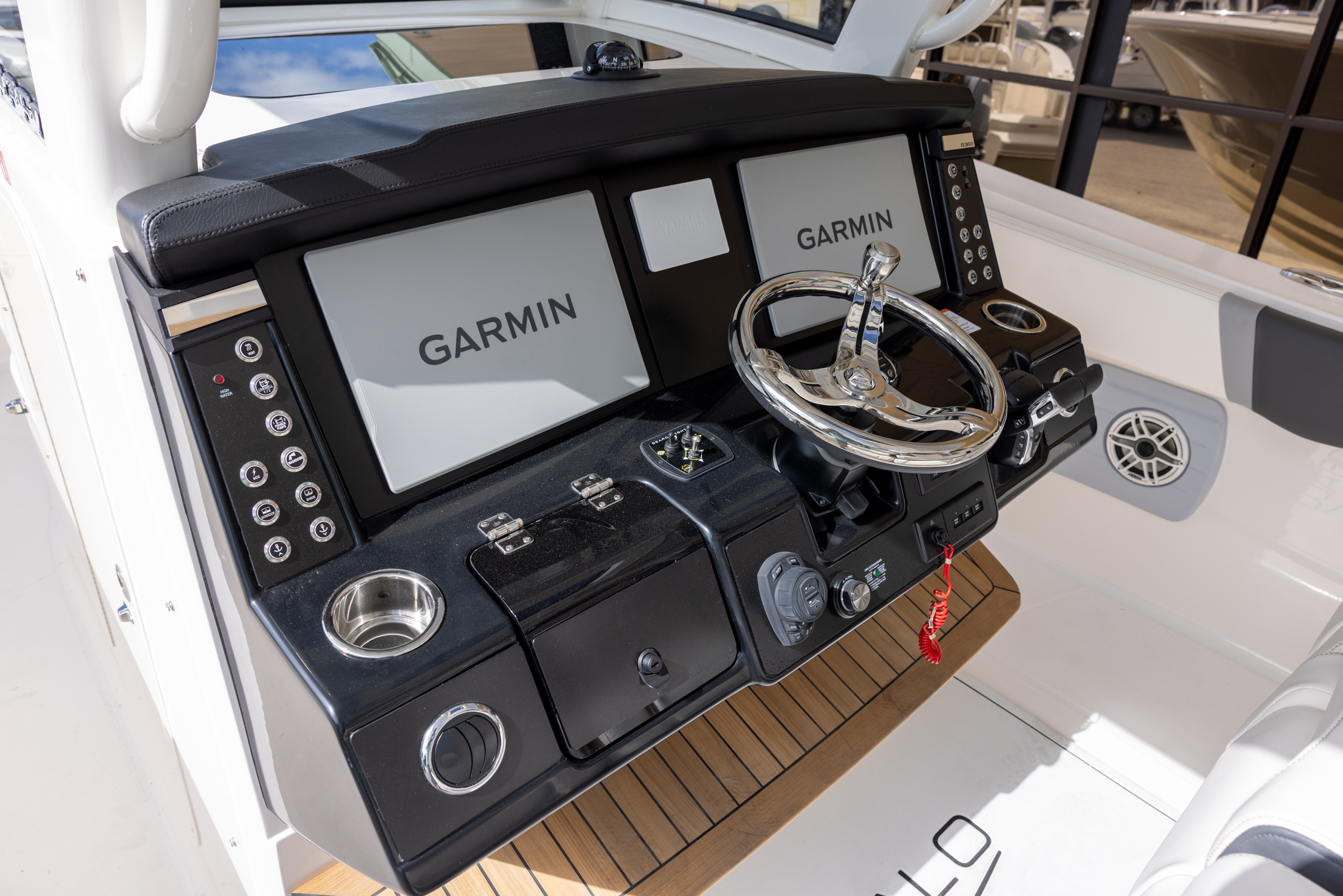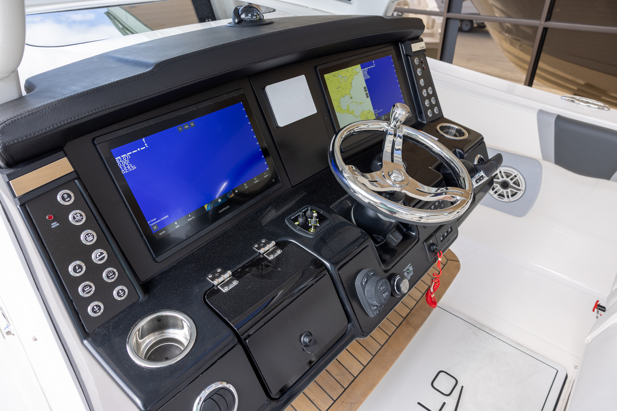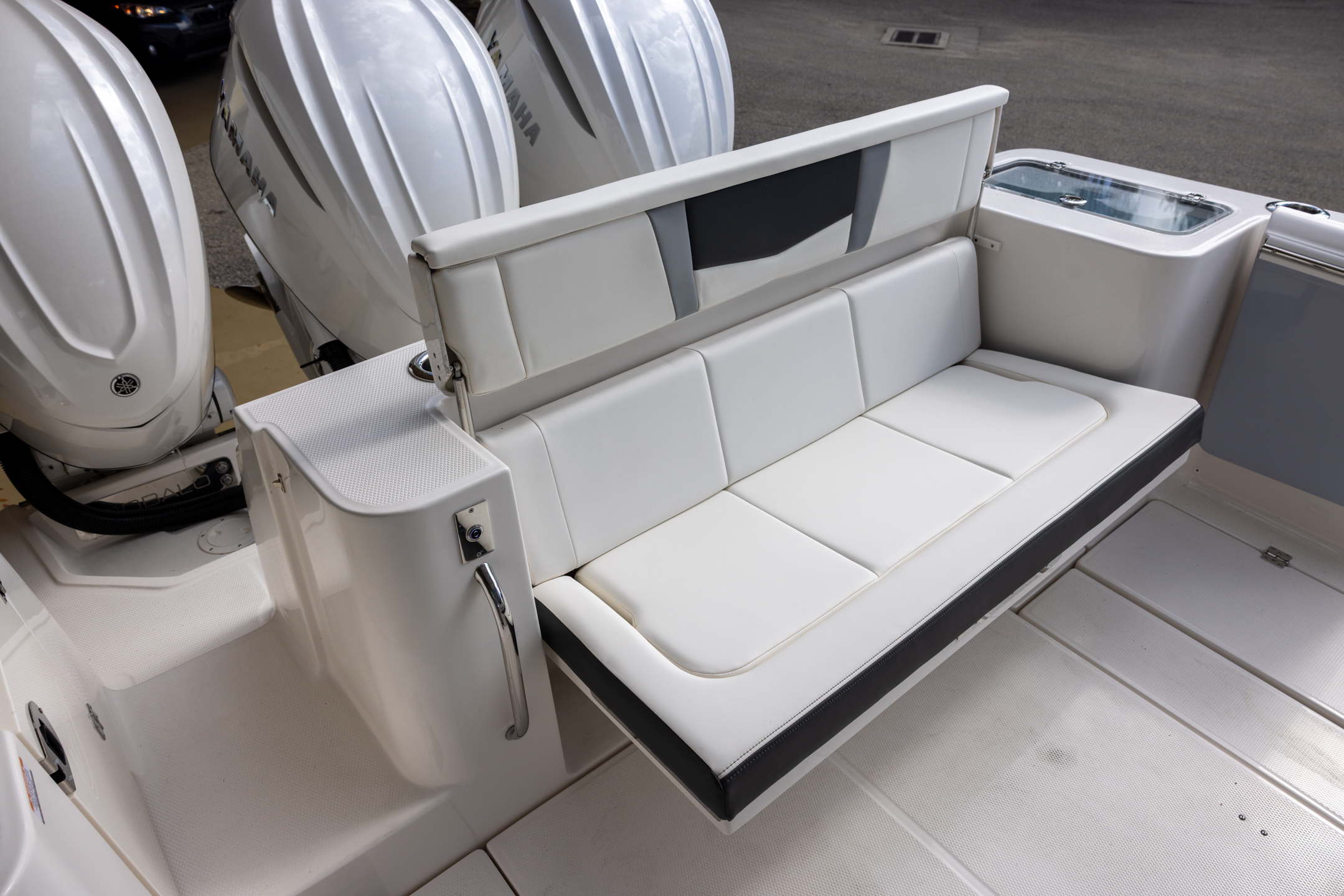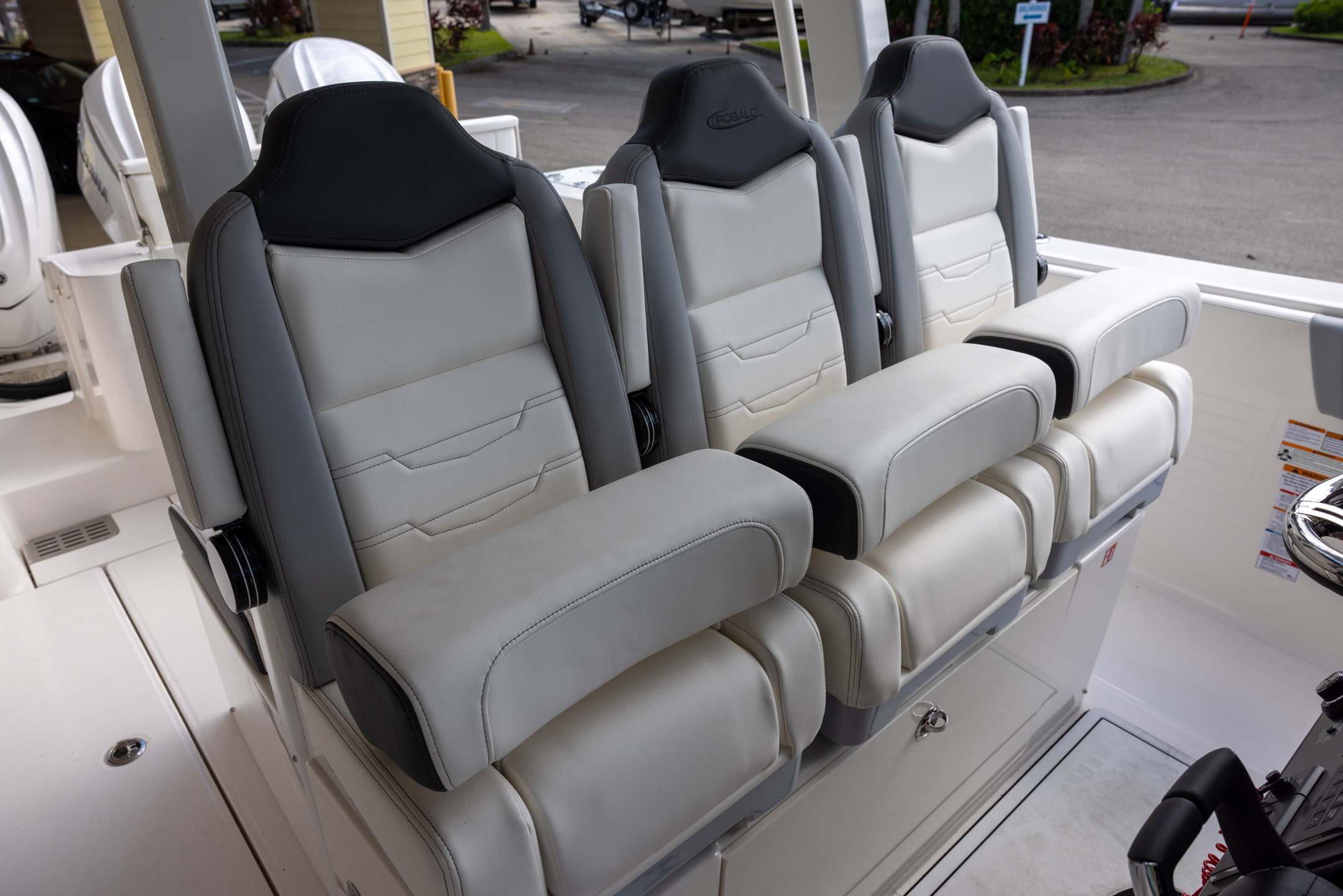 - Three Forward Facing Helm Seats with Flip-Up Bolsters & Folding Arm Rests (Includes Center Electric Forward/Aft Controls)