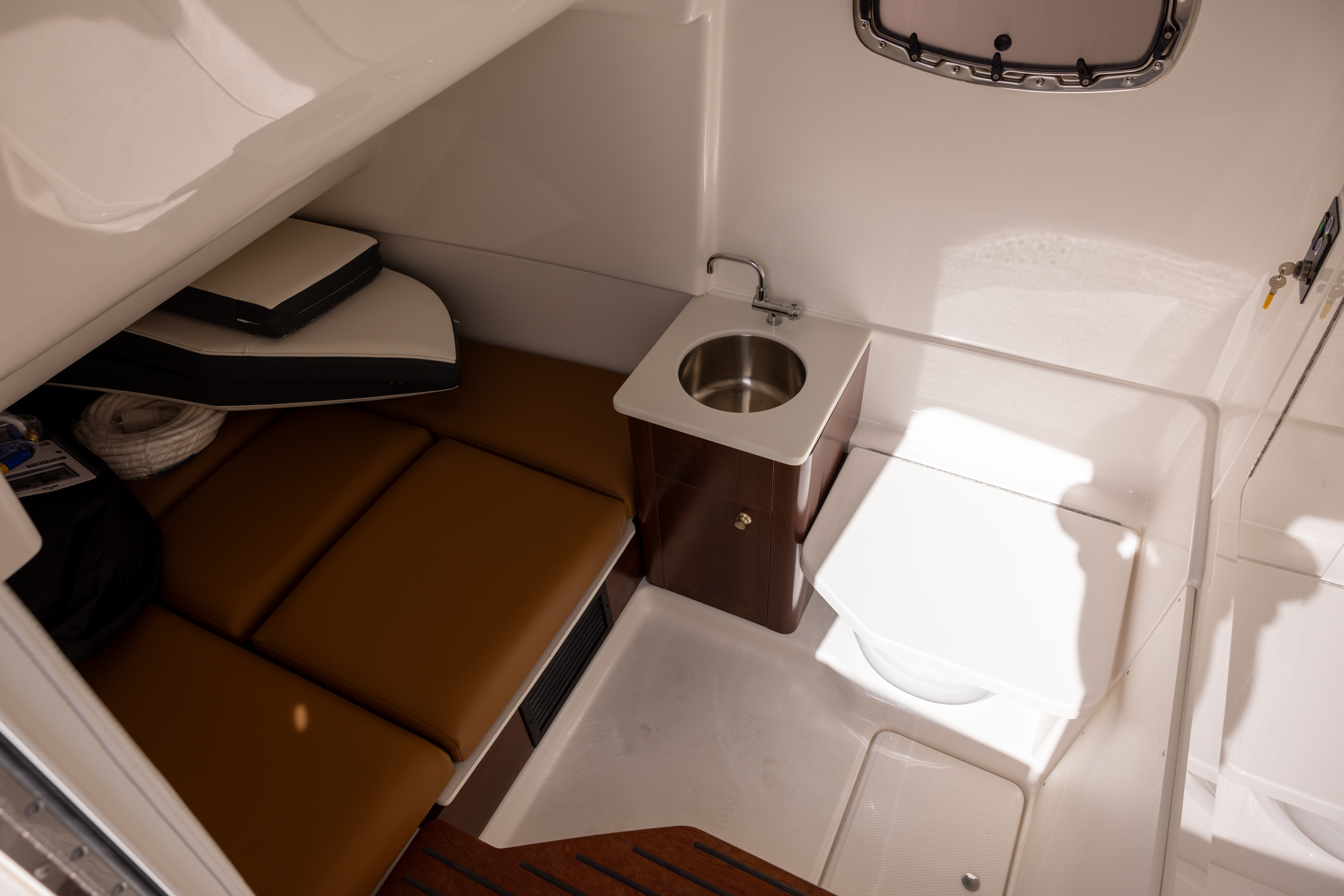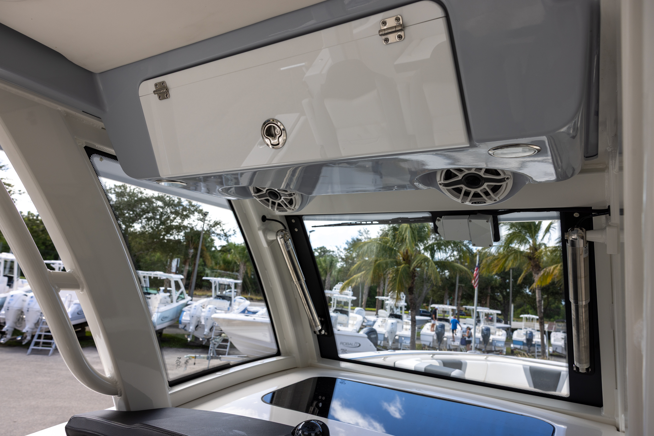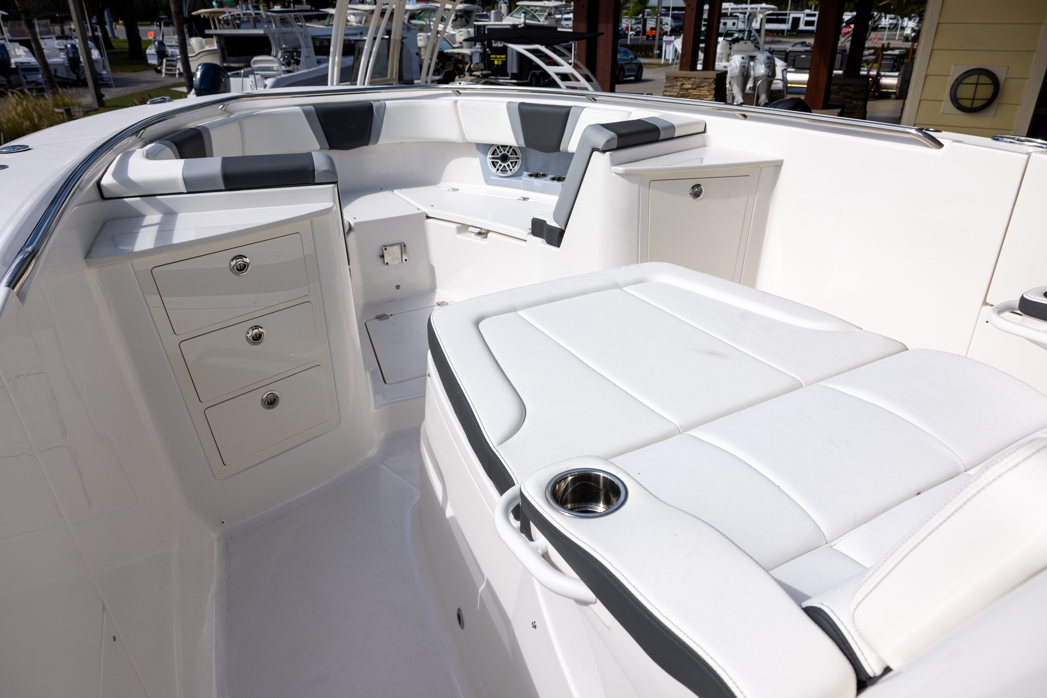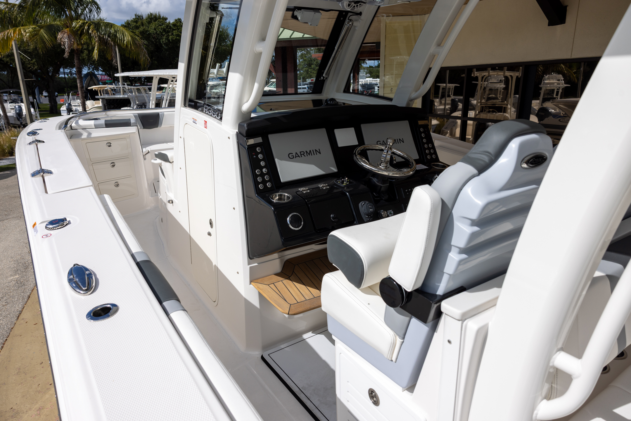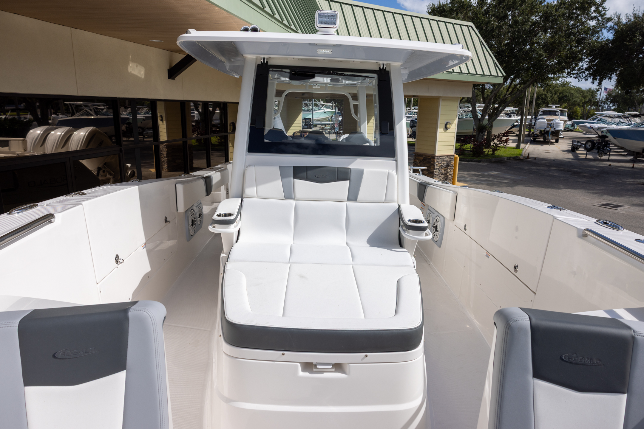 - Three Forward Facing Helm Seats with Flip-Up Bolsters & Folding Arm Rests (Includes Center Electric Forward/Aft Controls)