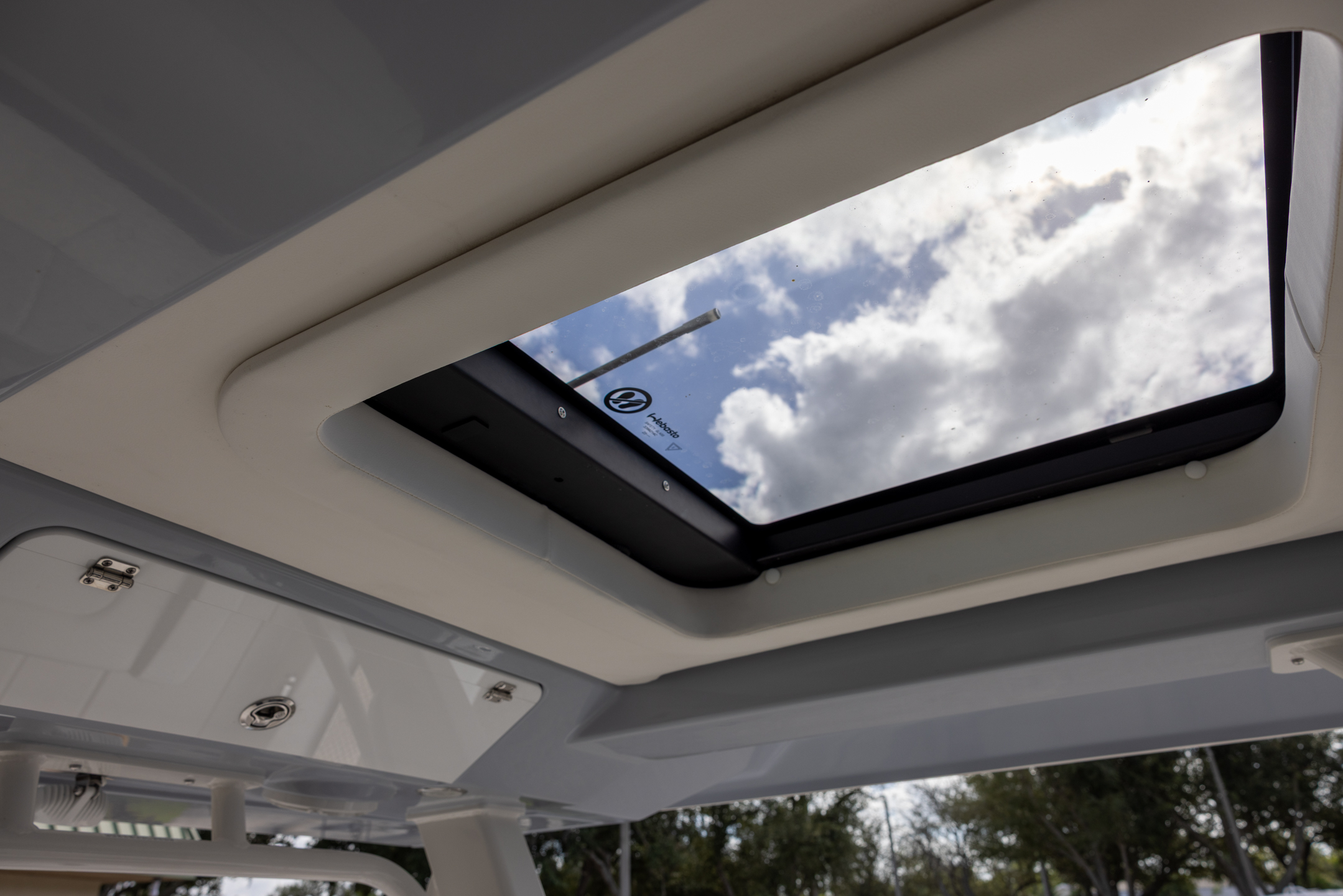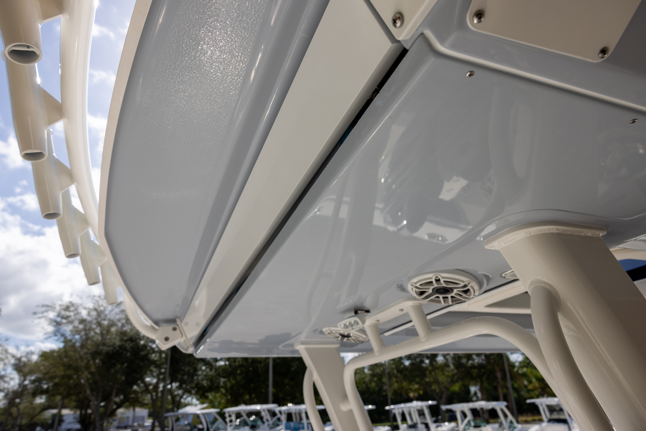 - Fiberglass Hardtop with Custom Powder Coated Frame (Black or White) Includes: Overhead Skylight, Electrically Actuated Rod Holder Frame, Electronics Box, Four Tri Color Map Lights (White Dimmable, Red, And Blue), Four Spreader Lights with Dual Color (White and Blue Dimmable), and Blue Overhead Courtesy Lighting