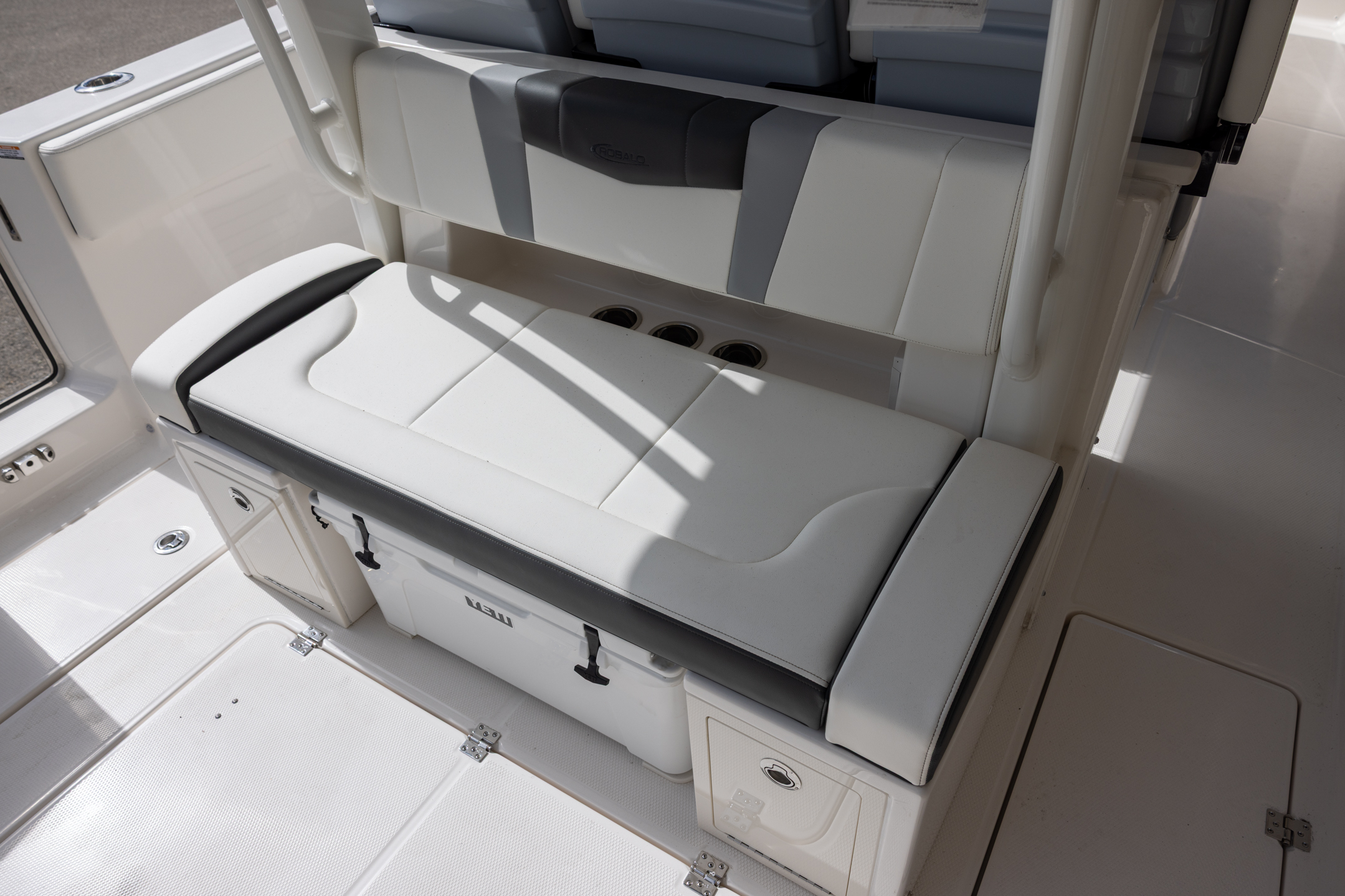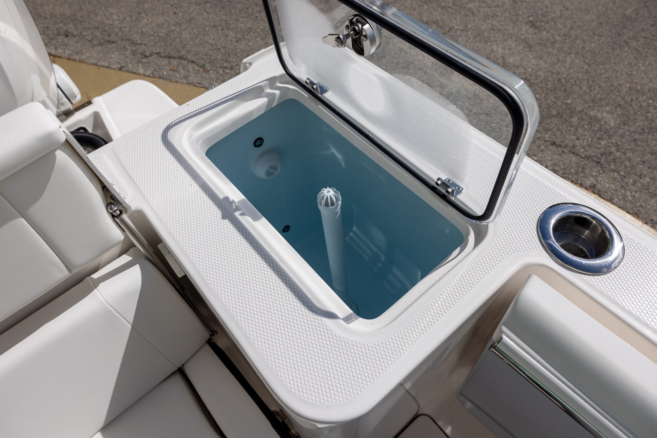 - Aft Facing Bench Seat with Stainless Steel Drink Holders & Removable Tackle Box Storage